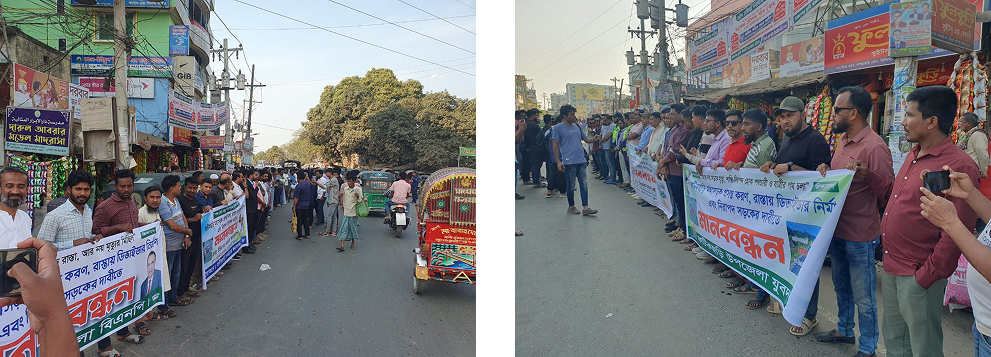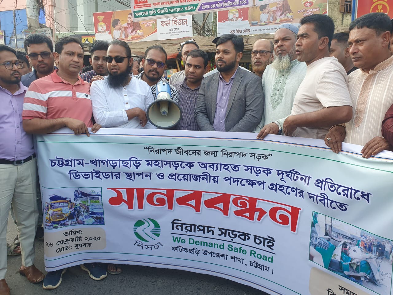 আজ (২৬ফেব্রুয়ারি২০২৫)রোজ বুধবার ফটিকছড়ি থানার অন্তর্গত বিবিরহাট পৌরসভার বাস স্টেশন এলাকায় বিক্ষোভ মিছিল ও মানববন্ধন কর্মসূচি পালন করে স্থানীয় সচেতন জনগন ও নিরাপদ সড়ক চাই ফটিকছড়ি উপজেলা শাখা (নিসচা)সহ বিভিন্ন রাজনৈতিক দলের নেতাকর্মী।