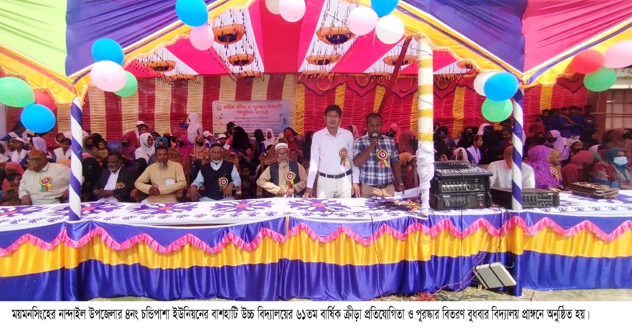 ময়মনসিংহের নান্দাইল উপজেলার ৪নং চন্ডিপাশা ইউনিয়নের অন্যতম মাধ্যমিক শিক্ষা প্রতিষ্ঠান বাশহাটি উচ্চ বিদ্যালয়ের ৬১তম বার্ষিক ক্রীড়া প্রতিযোগিতা ও পুরস্কার বিতরণ অনুষ্ঠিত হয়েছে। বুধবার (২৬ ফেব্রুয়ারি) বিপুল উৎসাহ-উদ্দীপনা ও আনন্দঘন পরিবেশে অত্র বিদ্যালয় খেলার মাঠে দিনব্যাপী ক্রীড়া প্রতিযোগিতা ও পুরস্কার বিতরণের বর্ণিল আয়োজন করা হয়। বাশহাটি উচ্চ বালিকা বিদ্যালয়ের ভারপ্রাপ্ত প্রধান শিক্ষক মুহাম্মদ রফিকুল ইসলাম ভূইয়ার সভাপতিত্বে ও সিনিয়র শিক্ষক শফিকুল ইসলাম রিপনের সঞ্চালনায় জাতীয় পতাকা উত্তোলন ও মশাল দৌড়ের মাধ্যমে অনুষ্ঠানের শুভ উদ্বোধন করা হয়।