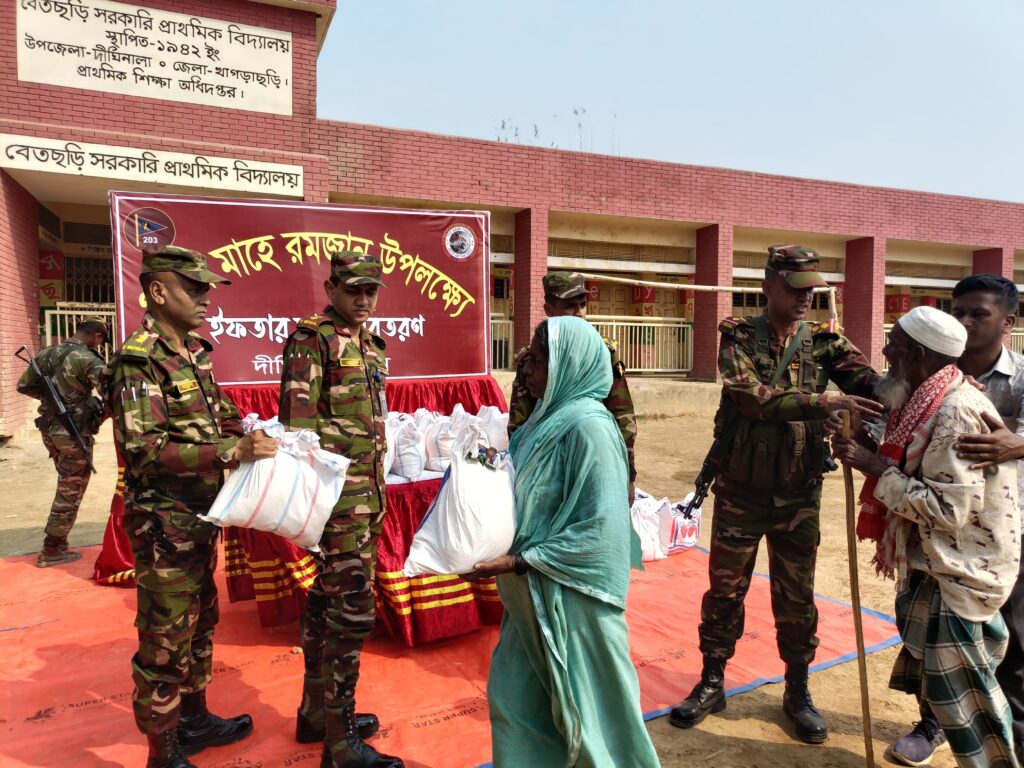 এরই ধারাবাহিকতায় আজ রবিবার সকালে মেরুং ইউনিয়নের ৪ নং ওয়ার্ডের বেতছড়ি সরকারি প্রাথমিক বিদ্যালয় মাঠে শতাধিক স্থানীয় গরিব, অসহায় এবং দুস্থ পরিবারের মাঝে ইফতার সামগ্রী বিতরণ করা হয়। ইফতার সামগ্রী বিতরণ করেন দীঘিনালা জোন অধিনায়ক লে. কর্ণেল ওমর ফারুক।