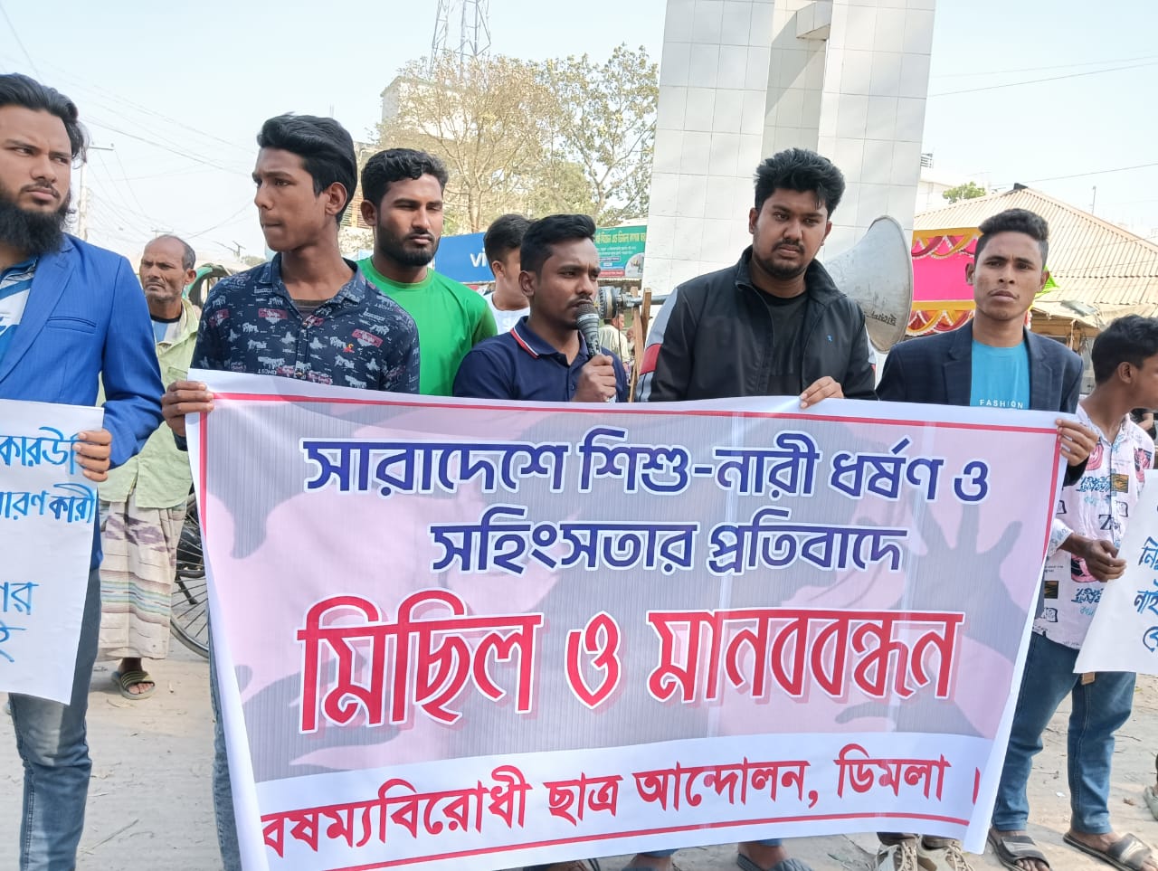 রবিবার ( মার্চ) দুপুর ২ টায় নীলফামারীর ডিমলা উপজেলা শুটিবাড়ি মোড় শহীদ স্মৃতি অম্লান চত্তরে ধর্ষণের স্বীকারোক্তি জবানবন্দির ভিডিও ভাইরাল করার প্রতিবাদে বৈষম্যবিরোধী ছাত্র আন্দোলন ডিমলা উপজেলার শাখার উদ্যোগে মানববন্ধন কর্মসূচি অনুষ্ঠিত হয়।