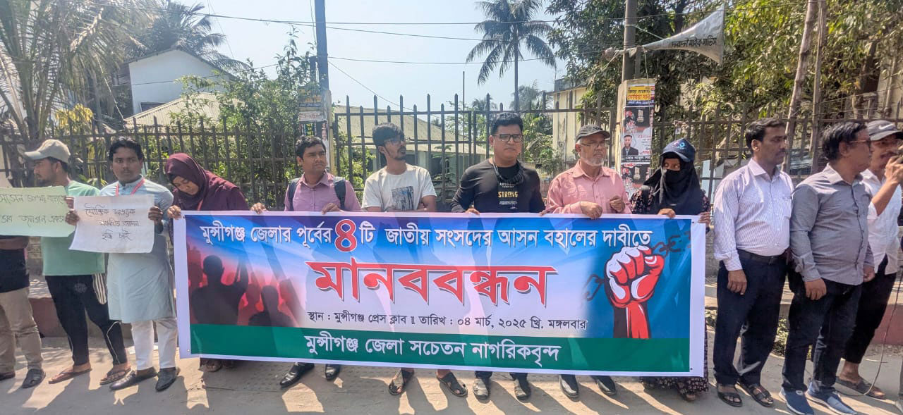 মুন্সীগঞ্জের সংকুচিত সংসদীয় আসনের যৌক্তিক সংখ্যাবৃদ্ধির দাবিতে মানববন্ধন কর্মসূচি পালিত হয়েছে। সোমবার দুপুর ১২টায় মুন্সীগঞ্জ প্রেসক্লাব ফটকে জেলার সচেতন নাগরিকবৃন্দের ব্যানারে ঘণ্টাব্যাপী এ মানববন্ধন কর্মসূচি অনুষ্ঠিত হয়। এতে অংশ নেন জেলার সুশীল সমাজ, সাংবাদিক, ছাত্র-শিক্ষকসহ বিভিন্ন শ্রেণিপেশার প্রতিনিধিরা।