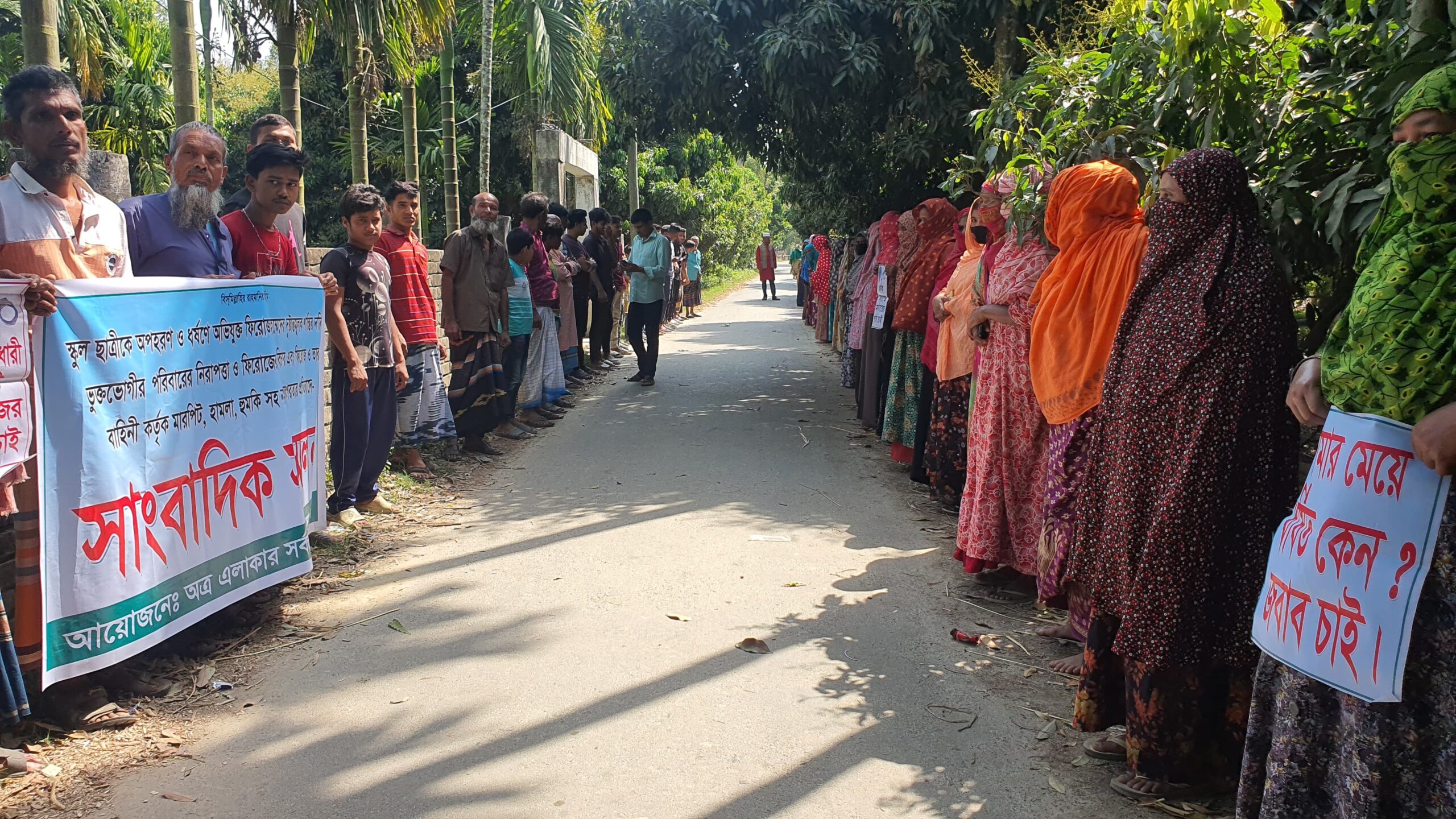 গুরুদাসপুর উপজেলার নাজিরপুর ইউনিয়নের মাহমুদপুর উত্তরপাড়া এলাকায় আজ বুধবার (৫ মার্চ) ভুক্তভোগী পরিবারের সদস্য ও স্থানীয় এলাকাবাসী মানববন্ধনের আয়োজন করেন।