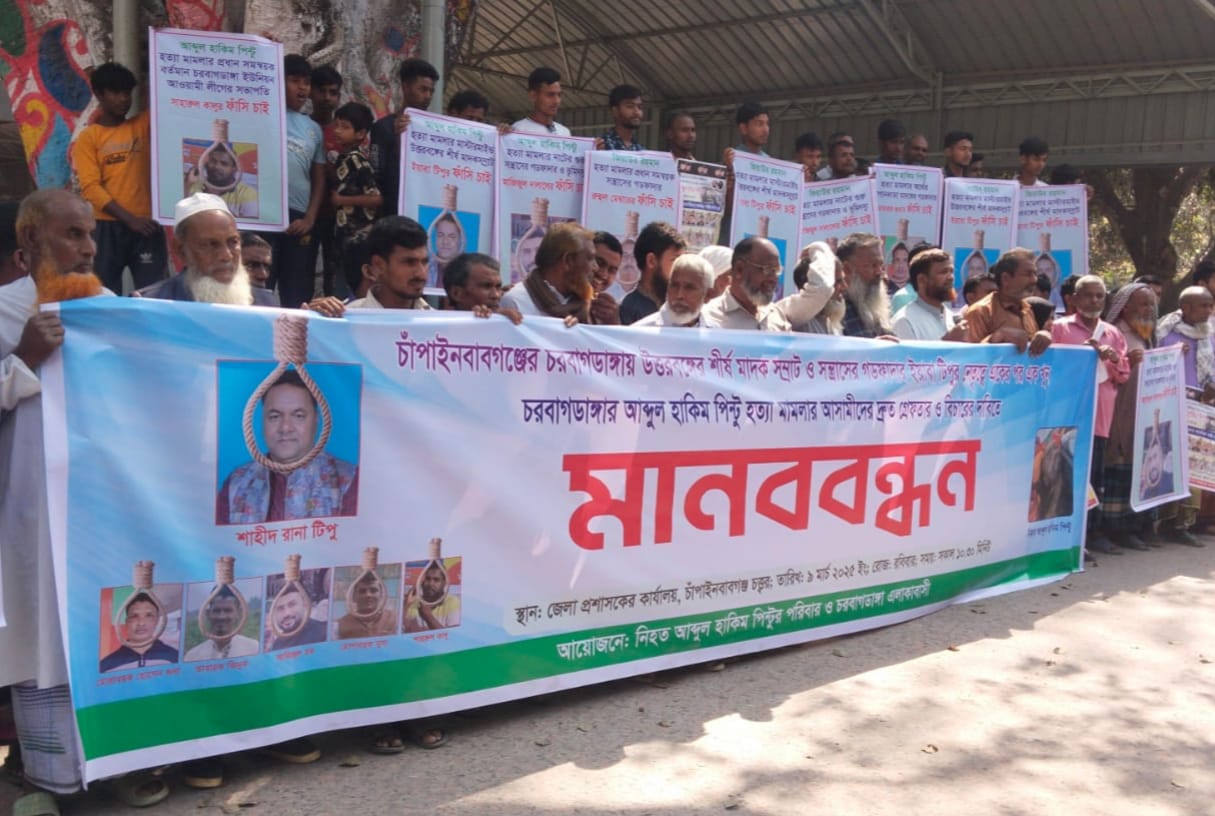 রবিবার (৯ মার্চ) সকাল সাড়ে ১০টায় চাঁপাইনবাবগঞ্জ জেলা প্রশাসকের কার্যালয়ের সামনে এ মানববন্ধনে নিহত পিন্টুর পরিবার, একই এলাকায় সংঘটিত অন্যান্য হত্যাকাণ্ডের ভুক্তভোগী পরিবার এবং নির্যাতিত স্থানীয় বাসিন্দারা অংশ নেন।