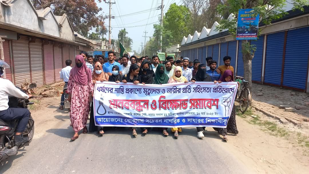 কুষ্টিয়ার খোকসায় ধর্ষণের সর্বোচ্চ শাস্তির দাবি এবং নারী নির্যাতনের প্রতিবাদে এক মানববন্ধন ও বিক্ষোভ সমাবেশ অনুষ্ঠিত হয়েছে। আজ সোমবার (১০ মার্চ ২০২৫) সকাল ১১টায় খোকসা সরকারি কলেজ প্রাঙ্গণ থেকে একটি প্রতিবাদী মিছিল বের হয়ে শহরের প্রধান সড়ক প্রদক্ষিণ করে খোকসা বাসস্ট্যান্ডে এসে শেষ হয়।