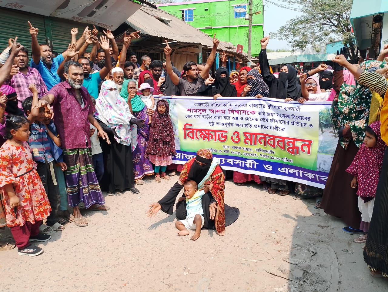 বালিয়াকান্দি-পাংশা সড়কের নারুয়া বাজারে ৩ শতাধিক এলাকার নারী-পুরুষের উপস্থিতিতে ঘন্টাব্যাপী মানববন্ধন চলাকালে বক্তব্য রাখেন, মুদি ব্যবসায়ী সামছুল আলমের বাবা সাদেক আলী বিশ্বাস, স্ত্রী জোৎস্না বেগম, মা সাহিদা বেগম, জাহাঙ্গীর বিশ্বাস, জান্নাতি বেগম, টিপু সুলতান, আলম শেখ, রানা বিশ্বাস প্রমুখ।