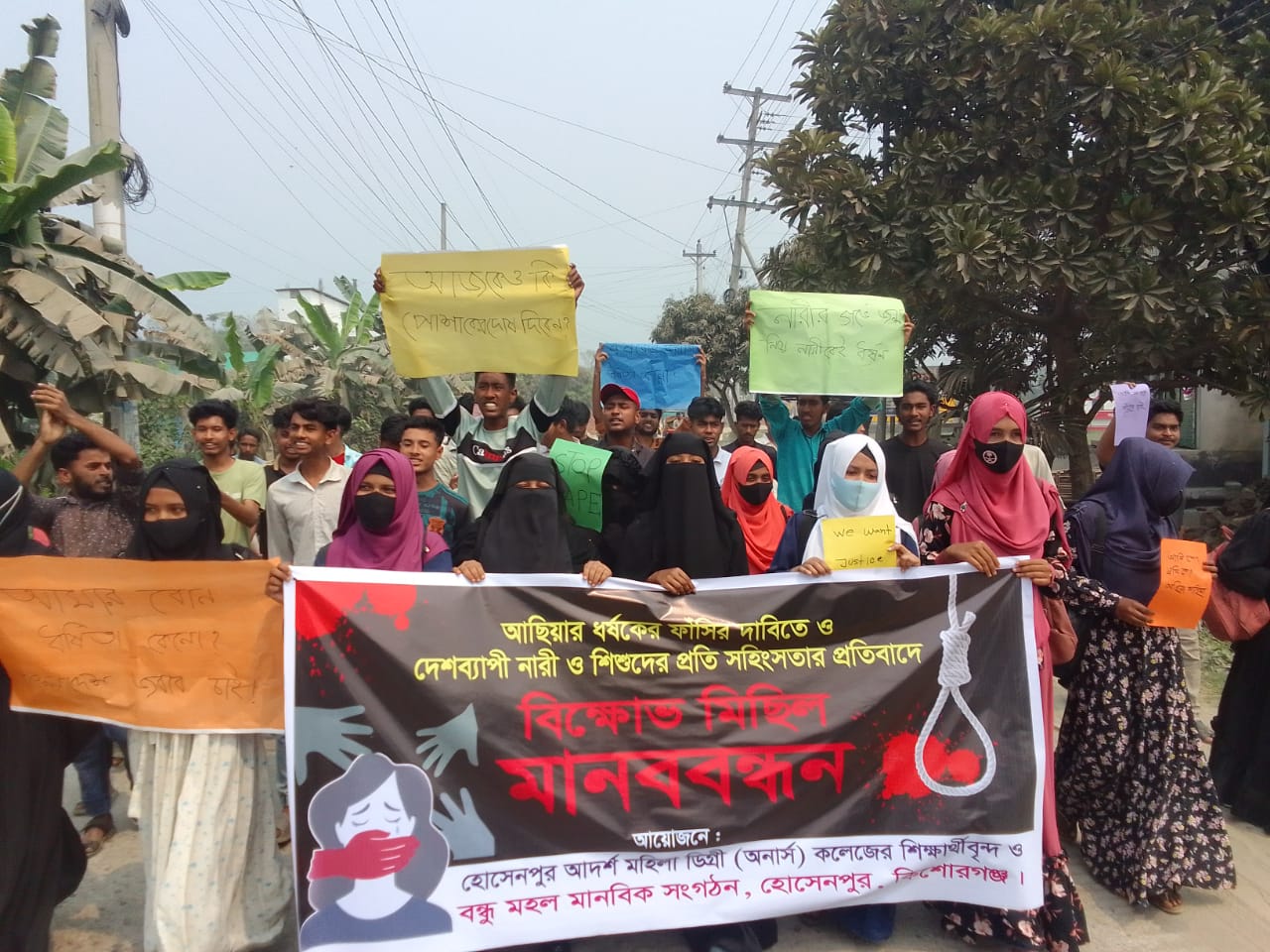 সারাদেশে নারীর প্রতি সহিংসতা, নিপীড়ন, ধর্ষণ, অনলাইনে হেনস্তা ও আইনশৃঙ্খলা পরিস্থিতি অবনতি এবং বিচারহীনতার প্রতিবাদে মানববন্ধন করেছে কিশোরগঞ্জের হোসেনপুর উপজেলার শিক্ষক ও শিক্ষার্থীরা। উপজেলার ঐতিহ্যবাহী হোসেনপুর আদর্শ মহিলা ডিগ্রি (অনার্স ) কলেজের সামনে অনুষ্ঠিত মানববন্ধন শেষে বিক্ষোভ মিছিল করে শিক্ষার্থীরা। মঙ্গলবার (১১ মার্চ) বিকেলে বিক্ষোভ মিছিলটি পৌর এলাকার বিভিন্ন সড়ক প্রদক্ষিণ করে উপজেলা পরিষদের সামনে এসে শেষ হয়। মানববন্ধনে শিক্ষার্থীরা মাগুরায় শিশু আছিয়ার কথা উল্লেখ করে বলেন, আইনশৃঙ্খলার অবনতি ও বিচারহীনতার কারণে দিনদিন অপরাধীর সংখ্যা বেড়ে যাচ্ছে। আমাদের মা-বোনরাও আজ নিরাপদ নয়।