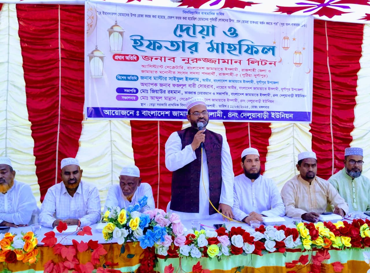 মঙ্গলবার বিকাল ৪ ঘটিকায় বাংলাদেশ জামায়াতে ইসলামী দুর্গাপুর উপজেলার ৪ নং দেলুয়াবাড়ি ইউনিয়ন কর্তৃক আয়োজিত কর্মী ও সুধীদের সম্মানে বেড়া প্রাইমারী স্কুল (কারবালা) মাঠে এক ইফতার মাহফিলে প্রধান অতিথীর বক্তব্যে জেলা জামায়াতের অ্যাসিস্ট্যান্ট সেক্রেটারি ও রাজশাহী-৫(পুঠিয়া- দুর্গাপুর) আসনে জামায়াত মনোনীত সংসদ সদস্য পদপ্রার্থী মুহাম্মদ নুরুজ্জামান লিটন এ কথাগুলো বলেন। তিনি আরো বলেন, রোজার মাধ্যমে মানুষের মনের পাশবিকতা দূর করে আত্ম সংযমের চেষ্টা চালাতে হবে। যাতে করে খুন-ধর্ষণ, রাহাজানি-হানাহানি, চুরি-ডাকাতি সমাজ থেকে দূর করা সম্ভব হয়।