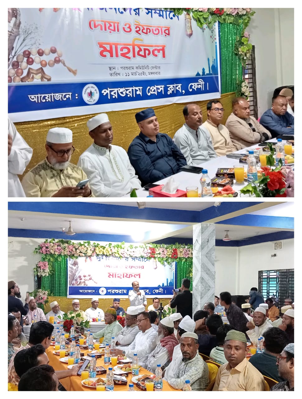 পরশুরাম প্রেসক্লাবের উদ্যোগে সুধীজনদের সম্মানে ইফতার ও দোয়া মাহফিল অনুষ্ঠিত হয়েছে। (১১ ই মার্চ) মঙ্গলবার পরশুরাম প্রেসক্লাবের সাবেক সাধারণ সম্পাদক গাজী মাসুদ রানার সঞ্চালনায় পরশুরাম কমিউনিটি সেন্টারে পরশুরাম প্রেসক্লাবের সভাপতি এম এ হাসানের সভাপতিত্বে অনুষ্ঠিত সুধীজনদের সম্মানে ইফতার মাহফিলে বিভিন্ন শ্রেণি প্রেসার মানুষের মিলন মেলায় পরিণত হয়। ইফতার ও দোয়া মাহফিলে উপস্থিত হয়ে বক্তব্য রাখেন পরশুরাম উপজেলা নির্বাহী কর্মকর্তা (ইউএনও) আরিফুর রহমান। পরশুরাম মডেল থানার ভারপ্রাপ্ত কর্মকর্তা (ওসি) মোহাম্মদ নুরুল হাকিম। বিএনপির কেন্দ্রীয় কমিটির নির্বাহী সদস্য ও সাবেক পরশুরাম পৌর মেয়র জনাব আবু তালেব। পরশুরাম উপজেলা বিএনপির আহবায়ক আব্দুল হালিম মানিক।