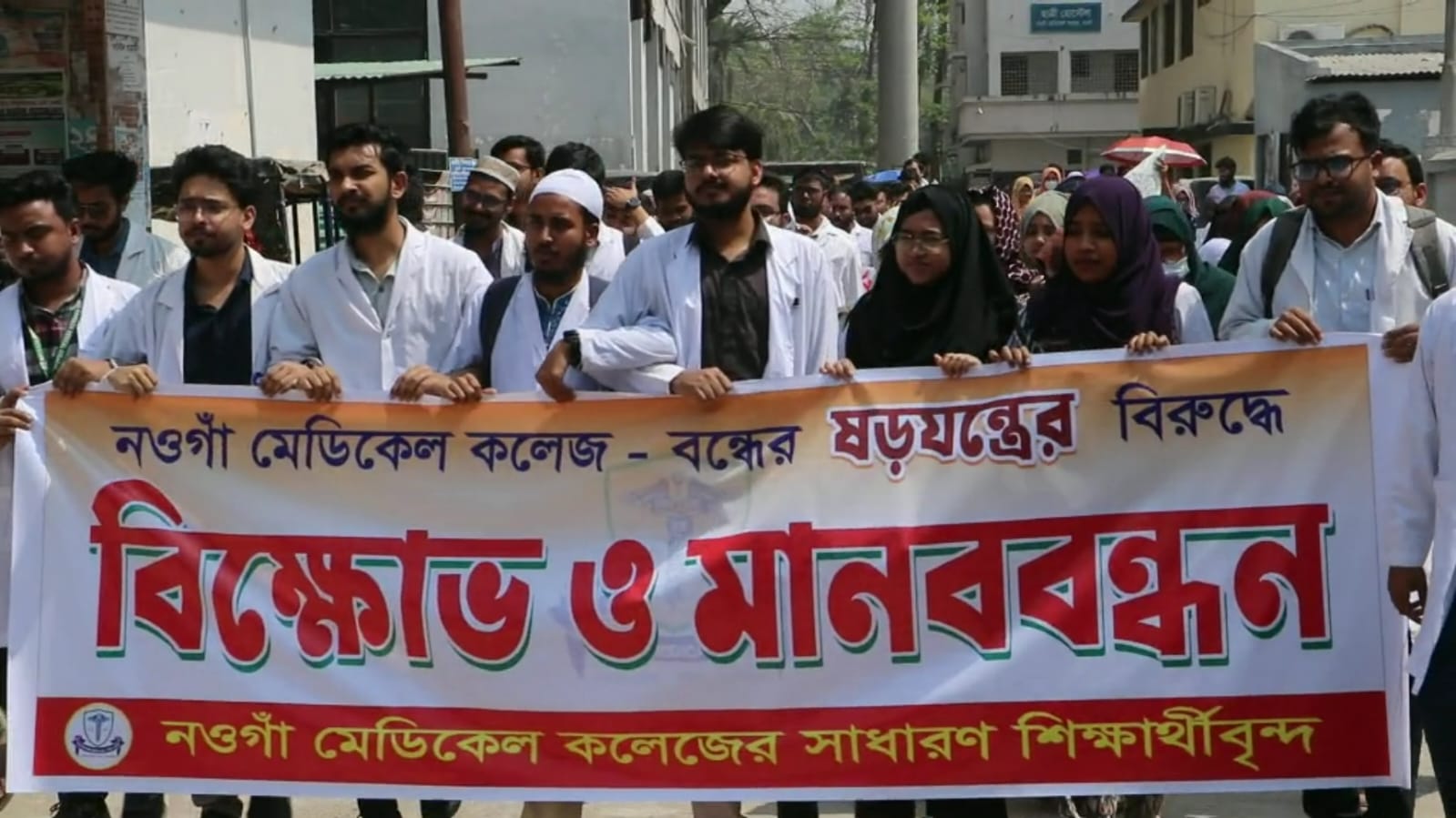 নওগাঁ মেডিকেল কলেজ বন্ধের ‘ষড়যন্ত্রের’ প্রতিবাদে বিক্ষোভ ও মানববন্ধন করা হয়েছে। আজ বৃহস্পতিবার বেলা সাড়ে ১১টায় মেডিকেল চত্বর থেকে শিক্ষার্থীদের উদ্যোগে একটি বিক্ষোভ মিছিল বের করে বিভিন্ন সড়ক প্রদক্ষিণ করে শহরের মুক্তির মোড়ে গিয়ে শেষ হয়। পরে সেখানে মানববন্ধন অনুষ্ঠিত হয়। এসময় বিভিন্ন শ্রেণির পেশার মানুুষ অংশ নেন।