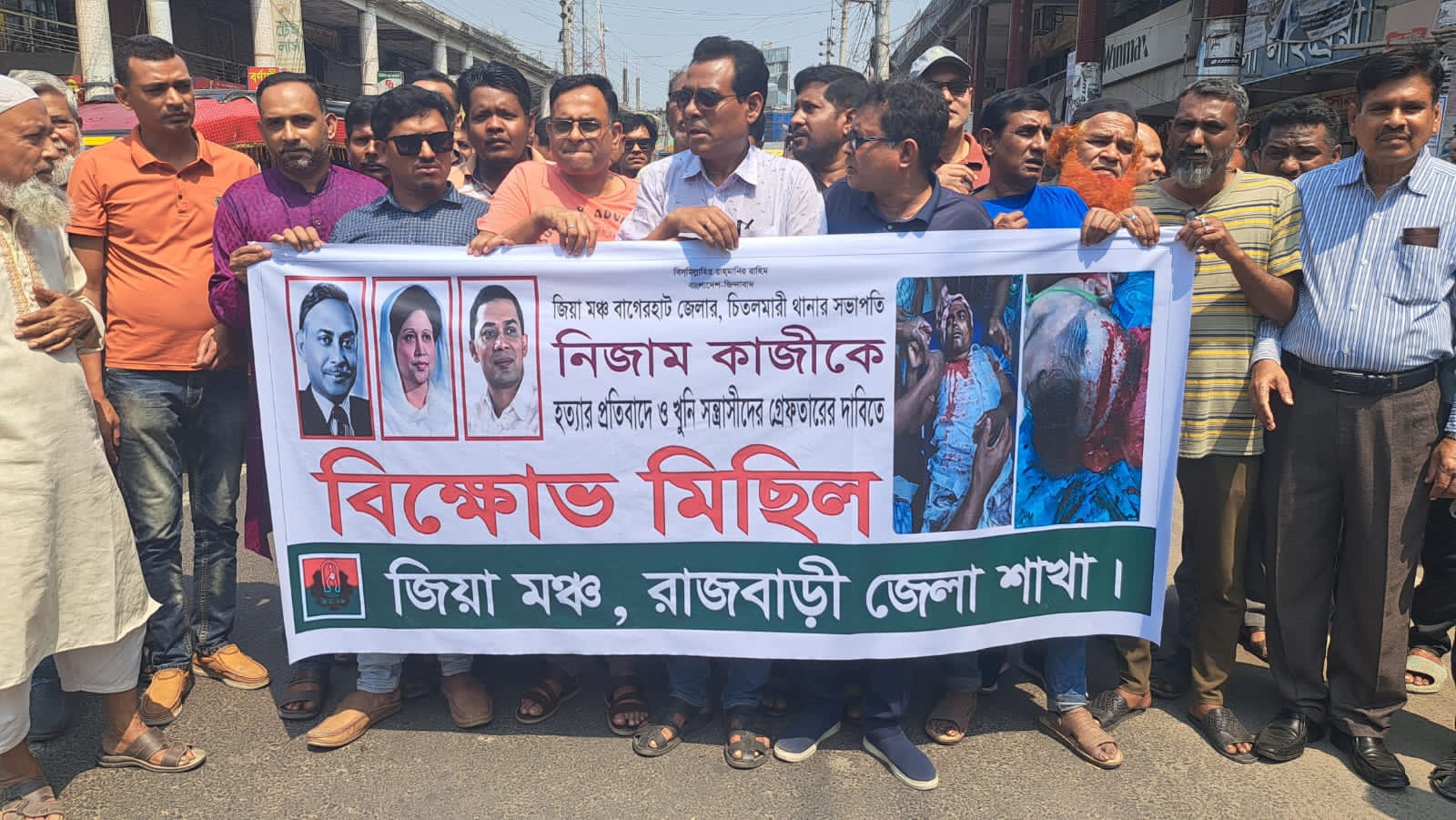 বাগেরহাটের চিতলমারী উপজেলা জিয়া মঞ্চের সভাপতি নিজাম কাজী হত্যার প্রতিবাদ ও দোষীদের গ্রেপ্তারের দাবিতে রাজবাড়ীতে বিক্ষোভ মিছিল অনুষ্ঠিত হয়েছে।