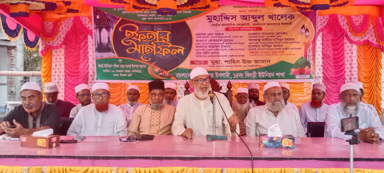 বাংলাদেশ জামায়াতে ইসলামী ফিংড়ী ইউনিয়ন শাখার উদ্যোগে ১৬ রমজান সোমবার ১৭ই মার্চ ফিংড়ী ইউনিয়ন পরিষদ চত্বরে ইফতার মাহফিল অনুষ্ঠিত হয়েছে। ফিংড়ী ইউনিয়ন জামায়াতের আমীর মুহাম্মদ শাহিন উজ জামান এর সভাপতিত্বে ও সেক্রেটারী মাওলানা জুম্মান আলী এর সঞ্চালনায় প্রধান অতিথি হিসেবে বক্তব্য রাখেন বাংলাদেশ জামায়াতে ইসলামীর কেন্দ্রীয় সাংগঠনিক সেক্রেটারী ও খুলনা অঞ্চল পরিচালক মুহাদ্দিস আব্দুল খালেক।