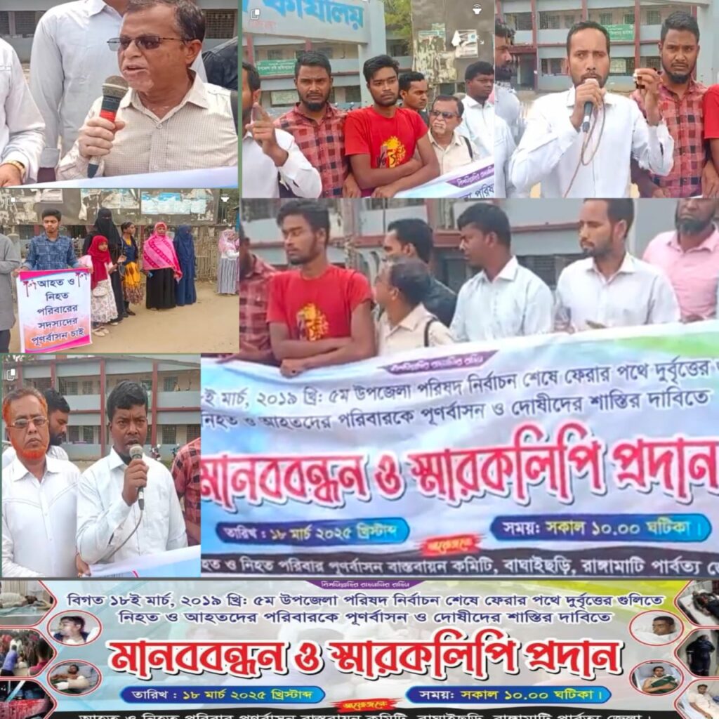 আজ সেই ভয়াল ১৮-ই মার্চ। ২০১৯ সালের এই দিনে ৫ম উপজেলা পরিষদ নির্বাচন শেষে ফেরার পথে দুর্বৃত্তের গুলিতে নিহত ও আহতদের পরিবারকে পূর্ণর্বাসন ও দোষীদের শাস্তির দাবিতে রাঙ্গামাটি জেলার বাঘাইছড়ি উপজেলা পরিষদের সামনে মানববন্ধন অনুষ্ঠিত হয়। মানববন্ধন শেষে উপজেলা নির্বাহী কর্মকর্তা বরাবরে স্মারকলিপি প্রদান করা হয়। মানববন্ধনে প্রধান অতিথির বক্তব্যে জনাব আব্দুল কাইয়ুম দাবি করেন- পার্বত্য চট্টগ্রামে যত গুম, খুন, অপহরণ, নির্যাতন হয়েছে তার সকল বিচার যেন আন্তর্জাতিক অপরাধ ট্রাইবুনালের মাধ্যমে সম্পন্ন করা হয়। তিনি আরো দাবি করেন যে, উক্ত ঘটনায় যারা নিহত ও আহত হয়েছেন তাদের পরিবারকে যথাযথ পুনর্বাসনসহ সরকারি বিভিন্ন দপ্তরে যেন যোগ্যতা অনুযায়ী চাকরি এবং আহতদের জন্য উন্নত চিকিৎসার ব্যবস্থা করা হয়। পার্বত্য এলাকা থেকে যতগুলো সেনা ক্যাম্প প্রত্যাহার করে নেয়া হয়েছে সে সব সেনা ক্যাম্প পুনঃস্থাপনসহ দুর্গম ও বিপজ্জনক এলাকা গুলোতে আরও সেনা ক্যাম্প বৃদ্ধির জন্য তিনি সরকারের কাছে জোর দাবি জানান। মানববন্ধনে জনাব আব্দুল কাইয়ুম বর্তমান অন্তর্বর্তী সরকারের কাছে উক্ত হত্যা কান্ডের সুষ্ঠু তদন্তসহ ন্যায় বিচার দাবি করেন।