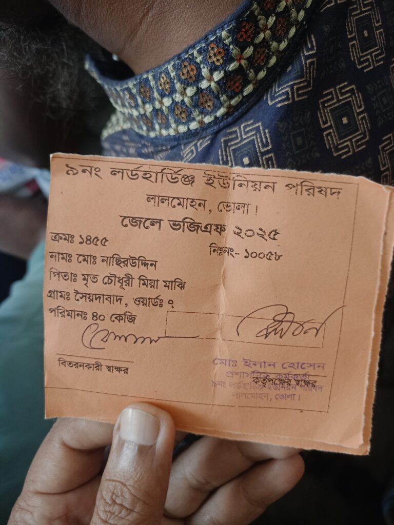 আজ ১৯/০৩/২০২৫ইং থেকে এই কার্যক্রম শুরু হয়েছে আজ ইউনিয়নের তিনটি ওয়ার্ডে চাল বিতরণ করা হয়।চাল বিতরণ করার সময় উপস্থিত ছিলেন লর্ডহার্ডিঞ্জ ইউনিয়ন বিএনপি, ইসলামী আন্দোলন বাংলাদেশ, বাংলাদেশ জামায়াতে ইসলামীর বিভিন্ন পর্যায়ের নেতারা তবে বর্তমান ইউনিয়ন পরিষদের চেয়ারম্যান আবুল কাশেম মিয়া উপস্থিত ছিলেন না। তাঁর সাথে এই বিষয়ে আলোচনা করা যায়নি।