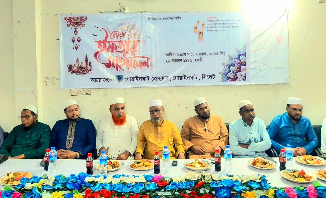রোববার (২৩ মার্চ)বিকেলে গোয়াইনঘাট প্রেসক্লাব হলরুমে ইফতার ও দোয়া মাহফিল অনুষ্ঠিত হয়।প্রেসক্লাবের সভাপতি সাংবাদিক মনজুর আহমদ ও সাধারন সম্পাদক মোঃ করিম মাহমুদ লিমন ও তথ্য ও প্রযুক্তি সম্পাদক আমির উদ্দিনের যৌথ পরিচালনায় শুভেচ্ছা বক্তব্য রাখেন প্রেসক্লাবের সাবেক সভাপতি এমএ মতিন।