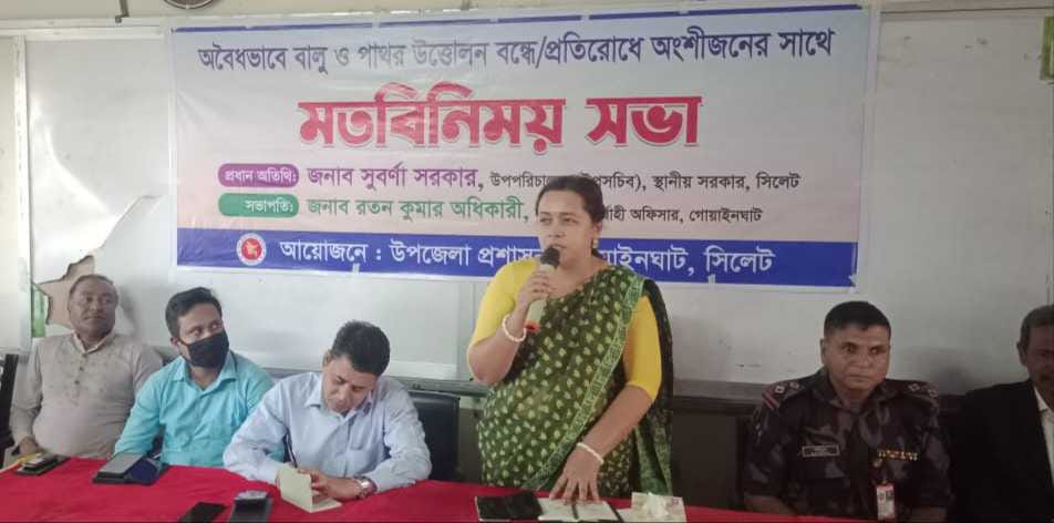 সিলেটের গোয়াইনঘাট উপজেলার জাফলংয়ে অবৈধভাবে বালু ও পাথর উত্তোলন বন্ধে অংশীজনের সাথে মতবিনিময় সভা অনুষ্ঠিত হয়েছে।সোমবার (২৪ মার্চ) বিকেলে আমির মিয়া উচ্চ বিদ্যালয়ের হলরুমে উপজেলা প্রশাসনের আয়োজনে এ মতবিনিময় সভা অনুষ্ঠিত হয়।গোয়াইনঘাট উপজেলা নির্বাহী কর্মকর্তা (ইউএনও) রতন কুমার অধিকারী’র সভাপতিত্বে সভায় প্রধান অতিথির বক্তব্য রাখেন, স্থানীয় সরকার সিলেটের উপপরিচালক (উপসচিব) সুবর্ণা সরকার।