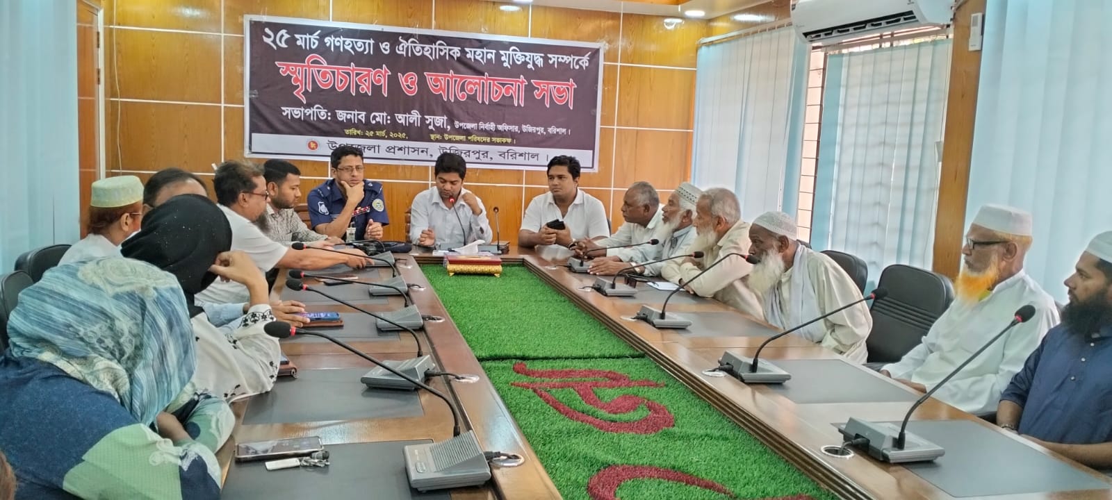 বরিশাল জেলার উজিরপুর উপজেলায় যথাযোগ্য মর্যাদায় ২৫ মার্চ গণহত্যা ও ঐতিহাসিক মহান মুক্তিযুদ্ধ সম্পর্কে স্মৃতিচারণ ও আলোচনা সভা অনুষ্ঠিত হয়েছে। এ সময় জুলাই – আগস্টে নিহত ও আহতদের পরিবারের মাঝে অনুদান তুলে দেওয়া হয়। ২৫ মার্চ মঙ্গলবার সকাল ১০টায় উপজেলা পরিষদ সভাকক্ষে, উপজেলা নির্বাহী কর্মকর্তা মোঃ আলী সুজার সভাপতিত্বে, উপজেলা সমাজসেবা কর্মকর্তা মোঃ আবুল কালাম আজাদের সঞ্চালনায়, বক্তব্য রাখেন উপজেলা সহকারী কমিশনার ভুমি মোঃ মাইনুল ইসলাম খান, উজিরপুর মডেল থানার অফিসার ইনচার্জ মোঃ আব্দুস সালাম, উপজেলা যুব উন্নয়ন কর্মকর্তা আসমা বেগম, বীর মুক্তিযোদ্ধা মোঃ আয়নাল হক, উপজেলা বিএনপির সাবেক সভাপতি, উপজেলা মুক্তিযোদ্ধা সংসদের সাবেক ডেপুটি কমান্ডার বীর মুক্তিযোদ্ধা মোঃ আব্দুল মাজেদ তালুকদার মান্নান মাষ্টার, বীর মুক্তিযোদ্ধা মোঃ মতিউর রহমান মোতালেব, আলোচনা সভা শেষে জুলাই-আগস্ট ২০২৫ এর ছাত্র-জনতার অভ্যুত্থানে ২ জন শহিদ ও ১৪ জন আহতদের মাঝে আর্থিক অনুদান প্রদান করেন নির্বাহী কর্মকর্তা মোঃ আলী সুজা। উপস্থিত ছিলেন বিভিন্ন দপ্তরের কর্মকর্তা, জুলাই-আগস্টের অভ্যুত্থানের শহীদ ও আহতদের স্বজনরা, সাংবাদিকবৃন্দ।