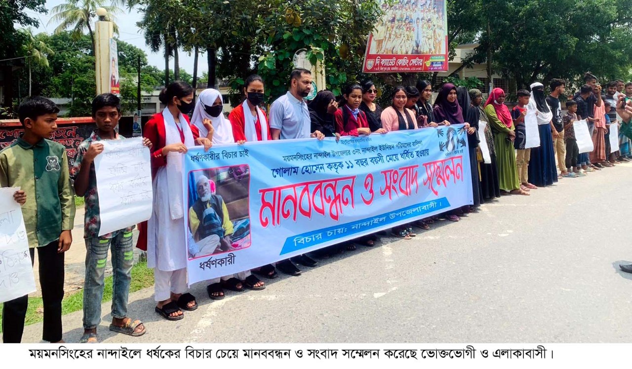 ময়মনসিংহের নান্দাইলে গোলাম হোসেন নামে এক ধর্ষকের বিচার চেয়ে মানবন্ধন ও সংবাদ সম্মেলন করেছে এলাকাবাসী। রোববার (১৮ মে) নান্দাইল উপজেলা পরিষদের সামনে ময়মনসিংহ টু কিশোরগঞ্জ মহাসড়কে এ মানববন্ধন শেষে উপজেলা পরিষদ চত্বরে সংবাদ সম্মেলন অনুষ্ঠিত হয়। ১১ বছর বয়সী শিশু ধর্ষণকারী গোলাম হোসেন (৭৫)কে দ্রুত গ্রেফতার করে আইনের আওতায় এনে দৃষ্টান্তমূলক শাস্তির দাবী জানিয়েছে ধর্ষিতার পরিবার ও এলাকাবাসী। মানবন্ধনে অংশগ্রহনকারীরা পুলিশ প্রশাসনের প্রতি তীব্র নিন্দা জানিয়েছে বলেন, থানায় অভিযোগ দায়েরের ৫ দিন পেরিয়ে গেলেও অভিযুক্ত ধর্ষক গ্রেফতার না হওয়ার বিষয়টি অতীব দু:খজনক। তাই অবিলম্বে গ্রেফতারের দাবী জানায় তাঁরা। জানাগেছে, অভিযুক্ত গোলাম হোসেন নান্দাইল ইউনিয়নের ভাটিসাভার বিলপাড় গ্রামের মৃত আসমত আলীর পুত্র। গত ১৩ই মে একই গ্রামের প্রতিবেশী ১১ বছরের শিশু কন্যাকে বিভিন্ন প্রলোভন দেখিয়ে পাটক্ষেতে নিয়ে একাধিকবার ধর্ষণ করে। এতে শিশুটি আহত হলে পরিবারের লোকজন মেয়েলি অসুখ হয়েছে বলে বিষয়টি প্রথমে এড়িয়ে যান। পরবর্তীতে মেয়ের নিকট থেকে ধর্ষণের বিষয় জানতে পেরে ওই শিশুর পিতা বাদী হয়ে নান্দাইল মডেল থানায় একটি লিখিত অভিযোগ দায়ের করে। এ ঘটনায় ১৪ মে শিশুটির জবানবন্ধী ও ডাক্তারি পরীক্ষার জন্য তাকে ময়মনসিংহ মেডিকেল কলেজ হাসপাতালে প্রেরণ করা হয়। নান্দাইল মডেল থানার অফিসার ইনচার্জ মোহাম্মদ আনোয়ার হোসেন বলেন, এ ঘটনায় মামলা নেওয়া হয়েছে। এছাড়া তথ্য প্রযুক্তির সাহায্যে অভিযুক্ত আসামীকে গ্রেফতারের চেষ্টা চলছে।