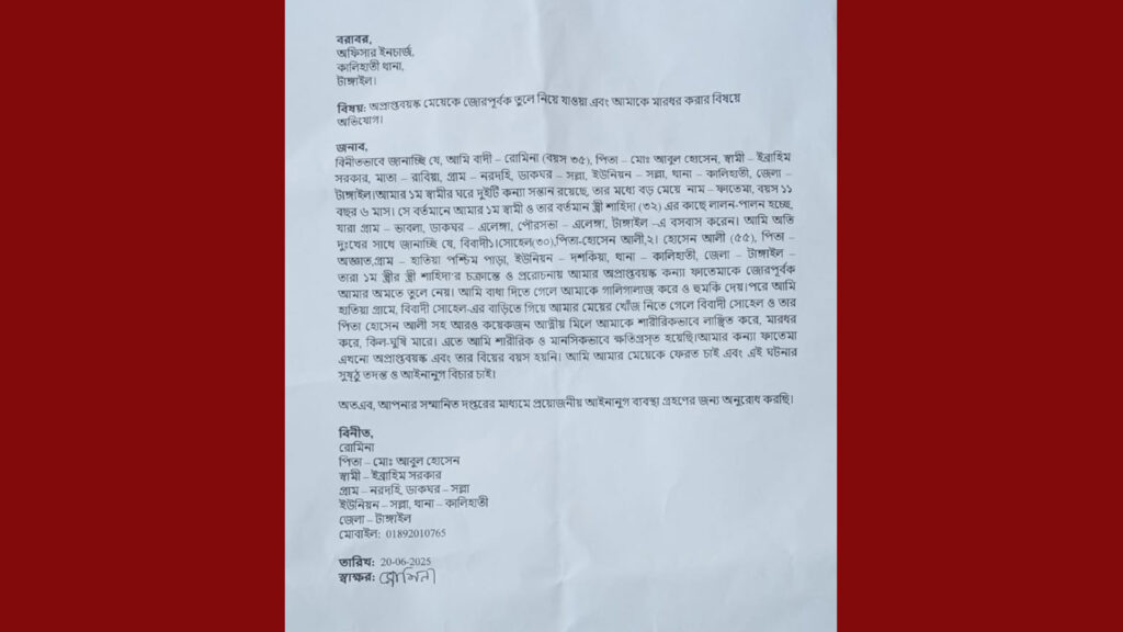 রুমিনার অভিযোগ, সৎ মা শাহিদার পরিকল্পনায় ফাতেমার বিয়ে ঠিক করা হয় কালিহাতীর দশকিয়া ইউনিয়নের হাতিয়া পশ্চিমপাড়া গ্রামের হোসেন আলীর ছেলে সোহেলের (৩০) সঙ্গে, যিনি একাধিকবার বিবাহিত। বৃহস্পতিবার রাতে ফাতেমাকে গোপনে সোহেলের বাড়িতে পাঠানো হয়, আর শুক্রবার (২০ জুন) সকালে বিয়ের প্রস্তুতিও সম্পন্ন হয়।