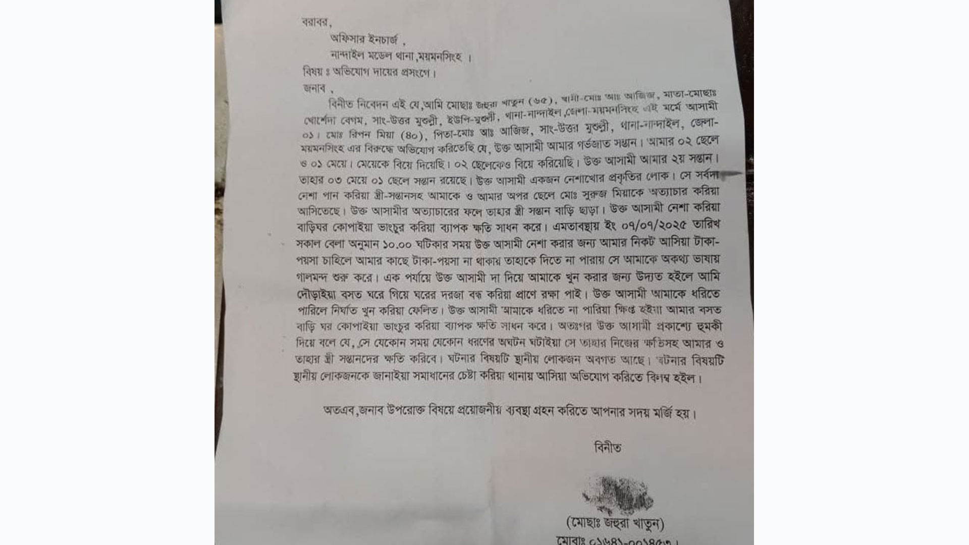 এই ঘটনায় জীবনের নিরাপত্তা চেয়ে ভুক্তভোগী মা মোছাঃ জোহরা খাতুন (৩৫) বাদী হয়ে তাঁর ছেলে মোঃ রিপন মিয়ার (৪০) বিরুদ্ধে নান্দাইল মডেল থানায় একটি লিখিত অভিযোগ দায়ের করেছেন।