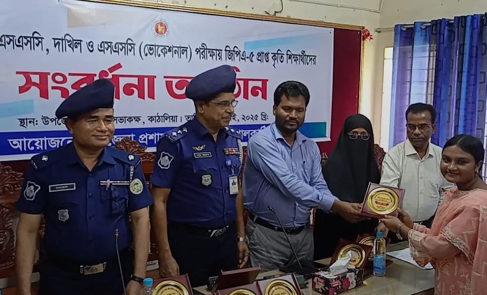 আজ ১৫ জুলাই মঙ্গলবার সকাল ১১ টায় উপজেলা পরিষদ সভাকক্ষে এ সংবর্ধনা অনুষ্ঠিত হয়। কাঠালিয়া উপজেলা প্রশাসন এর আয়োজন করেন। উপজেলার বিভিন্ন শিক্ষা প্রতিষ্ঠানের ২১ জন জিপিএ-৫ প্রাপ্ত শিক্ষর্থীদের উপজেলা প্রশাসনের পক্ষ থেকে প্রথমে ফুলে’ল শুভেচ্ছা, পরে প্রত্যেককে কৃতিত্বের স্বীকৃতি হিসেবে ক্রেস্ট প্রদান করা হয়েছে।