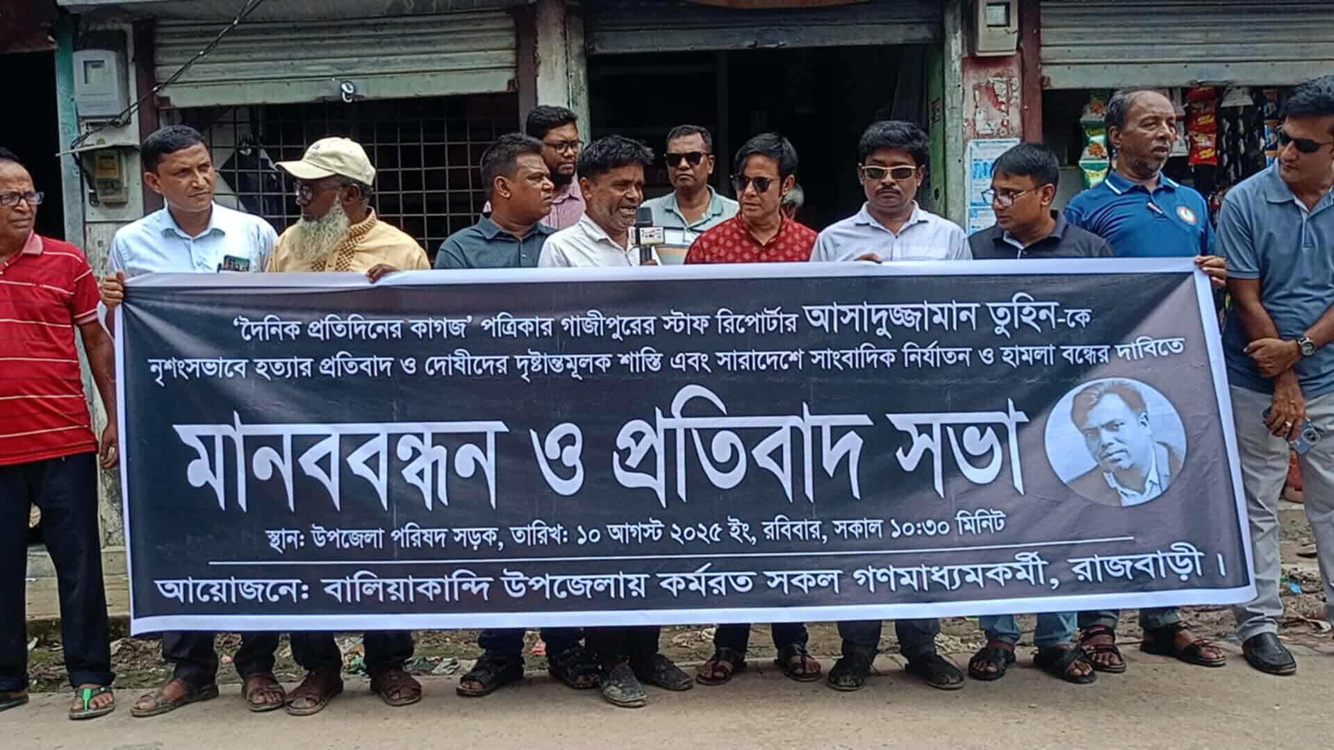গাজীপুরে সাংবাদিক আসাদুজ্জামান তুহিনকে কুপিয়ে হত্যা ও সারাদেশে সংবাদিক নির্যাতনের প্রতিবাদে হত্যাকারীদের দ্রুত গ্রেপ্তার ও দৃষ্টান্তমুলক শাস্তির দাবীতে রাজবাড়ীর বালিয়াকান্দিতে মানববন্ধন অনুষ্ঠিত হয়েছে।