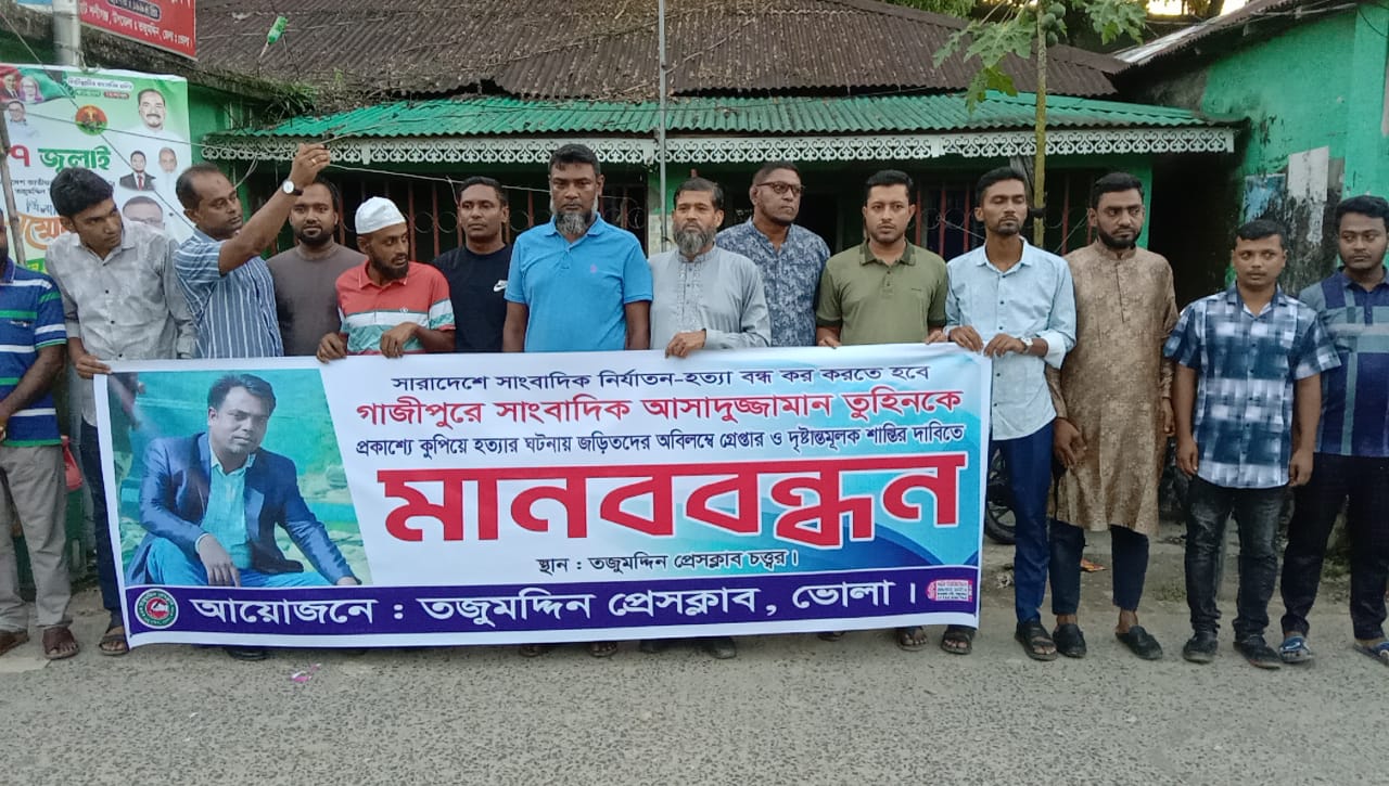 গতকাল বিকেল সাড়ে ৫টায় তজুমদ্দিন প্রেসক্লাব প্রাঙ্গণে এ মানববন্ধনের আয়োজন করা হয়।