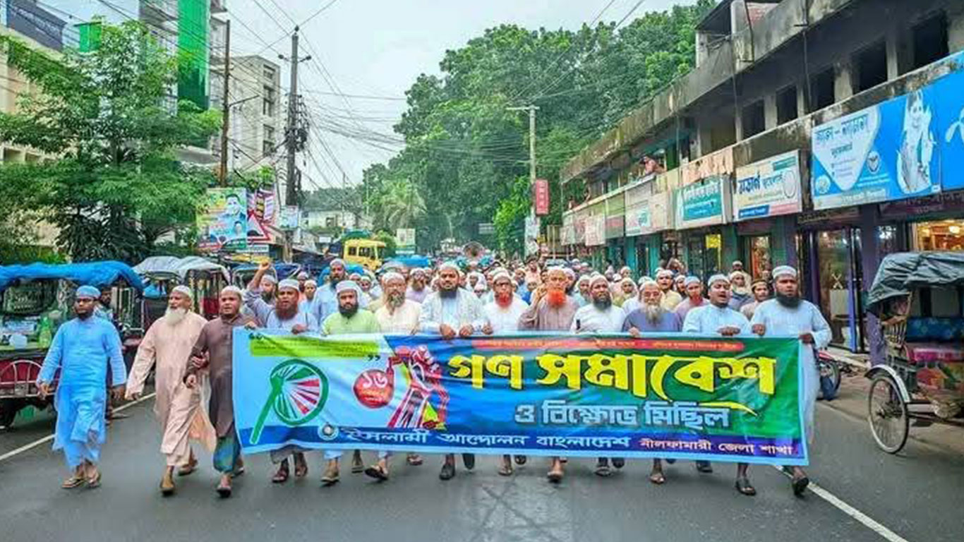 ইসলামী আন্দোলন বাংলাদেশ, নীলফামারী জেলা শাখার আয়োজনে তিন দফা দাবিতে বর্ণাঢ্য গণ সমাবেশ ও বিক্ষোভ মিছিল অনুষ্ঠিত হয়েছে। দাবি তিনটি হলো— পিআর (Proportional Representation) পদ্ধতিতে জাতীয় নির্বাচন আয়োজন, প্রয়োজনীয় রাষ্ট্র কাঠামো সংস্কার এবং সাম্প্রতিক সময়ের খুনিদের দৃশ্যমান বিচার।