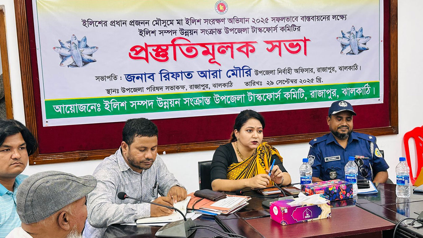 ইলিশের প্রধান প্রজনন মৌসুমে মা ইলিশ সংরক্ষণ অভিযান সফলভাবে বাস্তবায়নে ঝালকাঠির রাজাপুরে প্রস্তুতিমূলক সভা অনুষ্ঠিত হয়েছে। সোমবার (২৯ সেপ্টেম্বর) সকাল ১১টায় উপজেলা পরিষদ সভাকক্ষে উপজেলা টাস্কফোর্স কমিটির উদ্যোগে এ সভা অনুষ্ঠিত হয়।