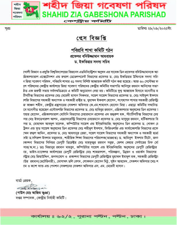 পটুয়াখালী বিজ্ঞান ও প্রযুক্তি বিশ্ববিদ্যালয়ের বিজনেস এডমিনিস্ট্রেশন অনুষদ এর সাবেক ডিন প্রফেসর বদিউজ্জামানকে আহবায়ক ও এগ্রিকালচারাল এক্সটেনশন এন্ড রুরাল ডেভেলপমেন্ট বিভাগের প্রফেসর ড.মো: ইকতিয়ার উদ্দিন কে সদস্যসচিব করে শহীদ জিয়া গবেষণা পরিষদ, পবিপ্রবি শাখার ৩১ সদস্য বিশিষ্ট আহ্বায়ক কমিটি গঠন করা হয়েছে