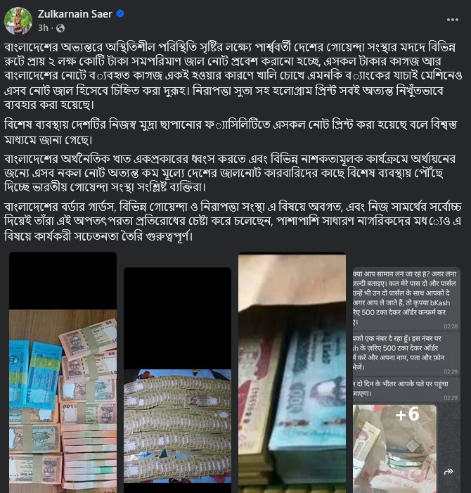 জুলকারনাইন সায়ের লিখেছেন, দেশের অভ্যন্তরে অস্থিতিশীল পরিস্থিতি তৈরির লক্ষ্যে পার্শ্ববর্তী দেশের গোয়েন্দা সংস্থার মদদে বিভিন্ন রুট ব্যবহার করে বিপুল পরিমাণ জাল নোট প্রবেশ করানো হচ্ছে।