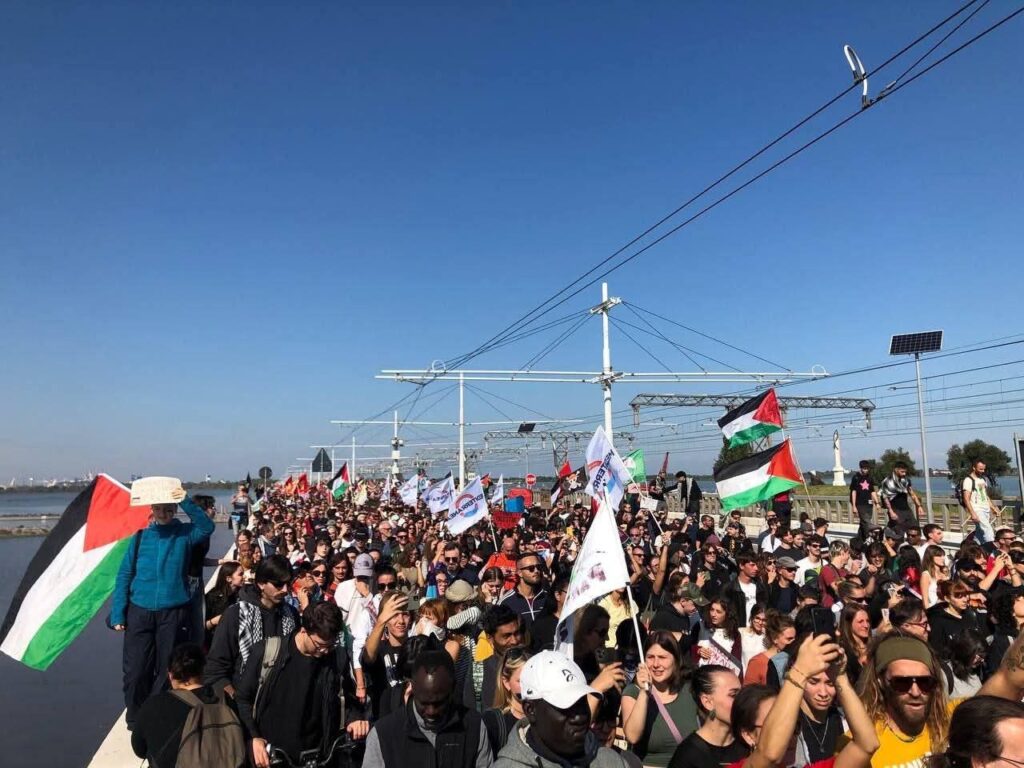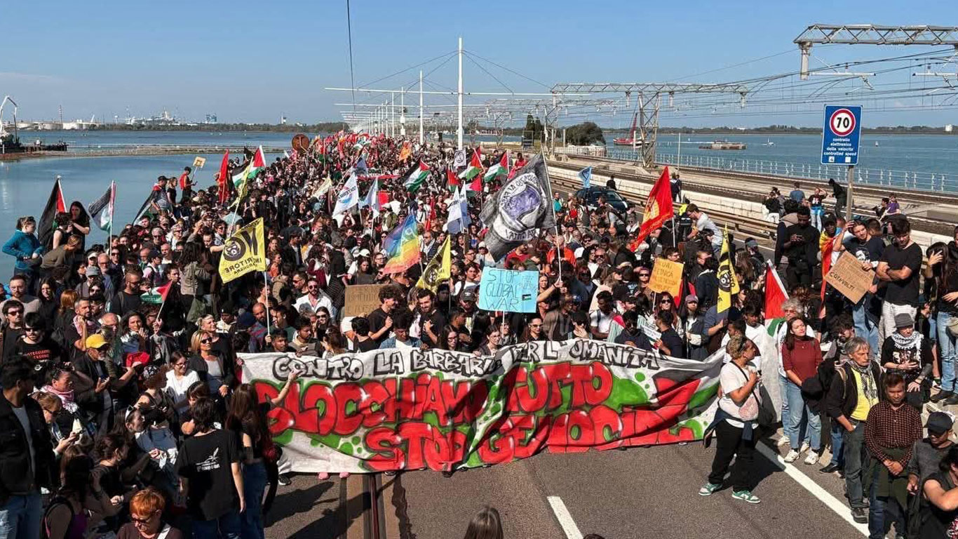 যেখানে ইতালি সাথে সব দেশের যোগাযোগ বন্ধ করে দিবে যতক্ষণ না বাকি বন্দিদের মুক্তি করা হচ্ছে এবং ফিলিস্তিনীর পক্ষে না যাচ্ছে। ভেনিসে আজ প্রায় ৩০ হাজার জনগন ও বিভিন্ন সংঘঠনের সহযোগিতা ফিলিস্তিনীর পক্ষে র্যালি বের করে ভেনিসের স্থল পথের সাথে ভেনিসের নৌপথ যোগাযোগ বিচ্ছিন্ন করা হয়।