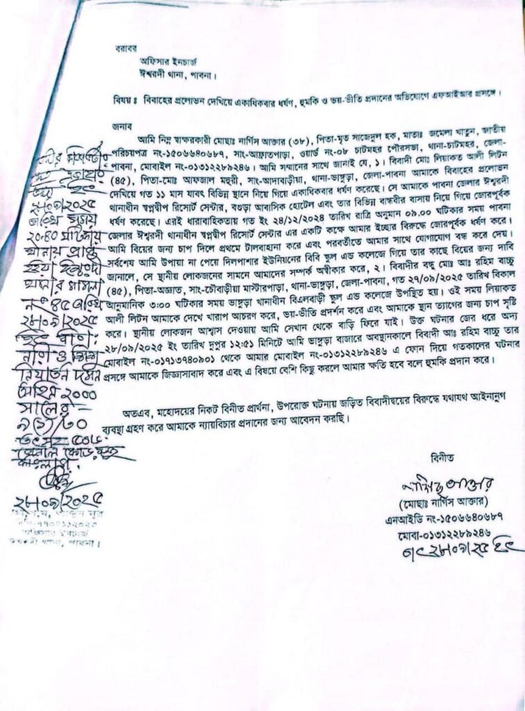 বাদী আরও জানান, তিনি ২৭ সেপ্টেম্বর ভাঙ্গুড়ার বিএলবাড়ী স্কুল অ্যান্ড কলেজ এলাকায় গিয়ে লিটনের সঙ্গে দেখা করে পুনরায় বিবাহের দাবি জানান। কিন্তু লিটন সেখানে তাকে ভয়-ভীতি প্রদর্শন করে ও স্থান ত্যাগের জন্য চাপ সৃষ্টি করেন। স্থানীয়রা আশ্বাস দেওয়ায় তিনি বাড়ি ফিরে যান।