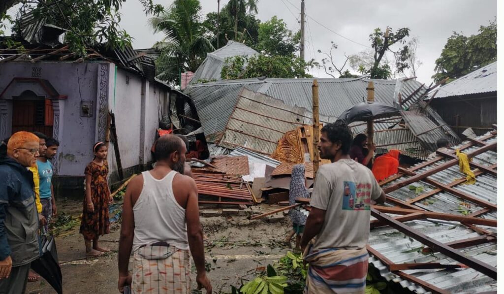 প্রত্যক্ষদর্শীরা জানান, ভারী বৃষ্টির মধ্যে হঠাৎ প্রবল ঘূর্ণিঝড় আঘাত করলে মুহূর্তের মধ্যে মাঝাপাড়া, বানিয়াপাড়া, হাজীপাড়া, পোদ্দারপাড়া, জিকরুল মেম্বারের পাড়া, বাবুপাড়া, চেয়ারম্যানপাড়া, বৈরাগীপাড়া, মুন্সিপাড়া, কালিরথানসহ অন্তত ১১টি পাড়া তছনছ হয়ে যায়। ঘরের টিন উড়ে গিয়ে গাছে ঝুলে থাকে।