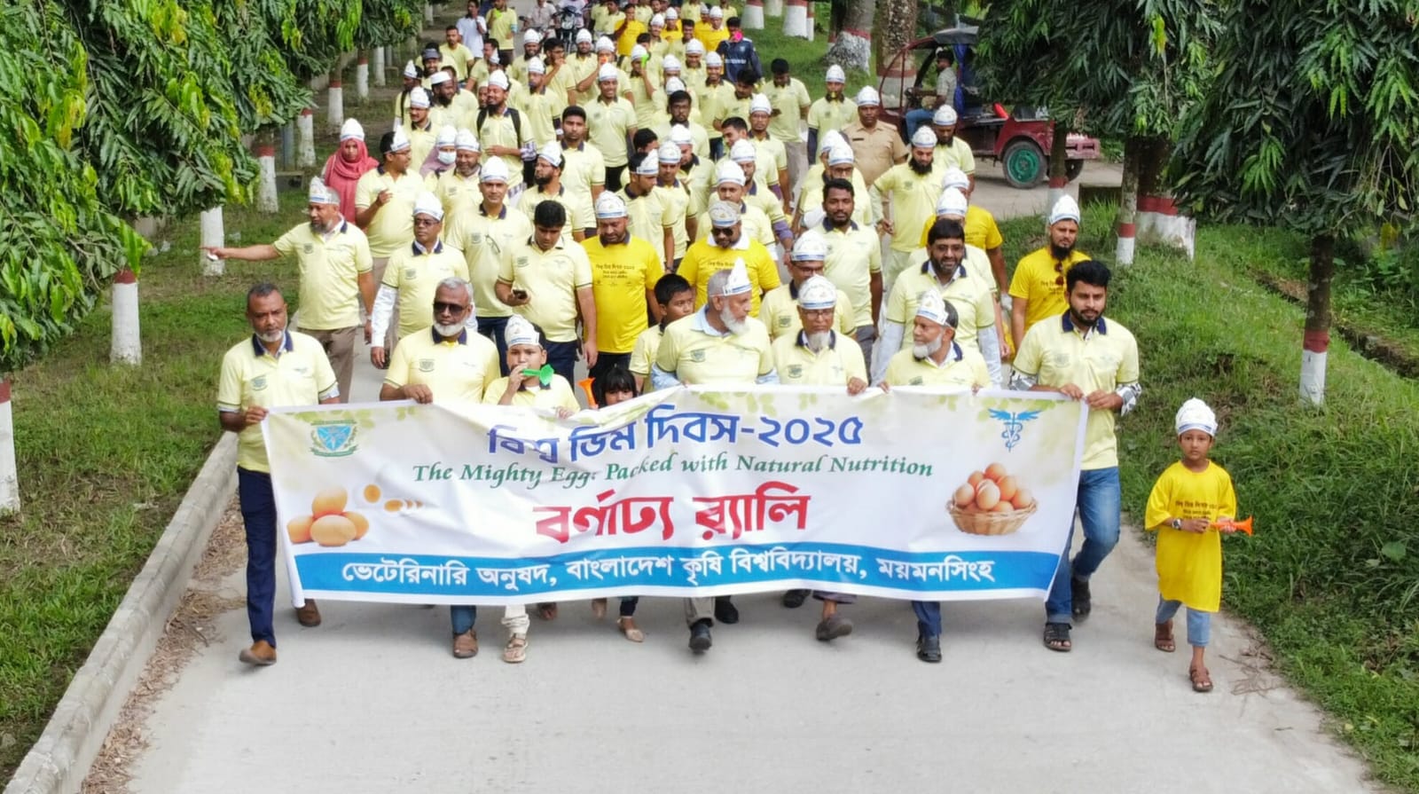 এরপর ডিম দিবস উপলক্ষে একটি বর্ণাঢ্য র্যালির আয়োজন করা হয়। র্যালিটি ক্যাম্পাসের বিভিন্ন সড়ক প্রদক্ষিণ করে সৈয়দ নজরুল ইসলাম সম্মেলন কক্ষে গিয়ে শেষ হয়। র্যালিতে ভেটেরিনারি অনুষদের শিক্ষক, শিক্ষার্থী ও পোলট্রি উদ্যোক্তারা অংশ নেন। র্যালি শেষে অনুষদীয় গেইট সংলগ্ন একটি স্টলে শিক্ষার্থী, পথচারী ও শ্রমজীবী মানুষদের মধ্যে বিনামূল্যে ডিম বিতরণ করা হয়।