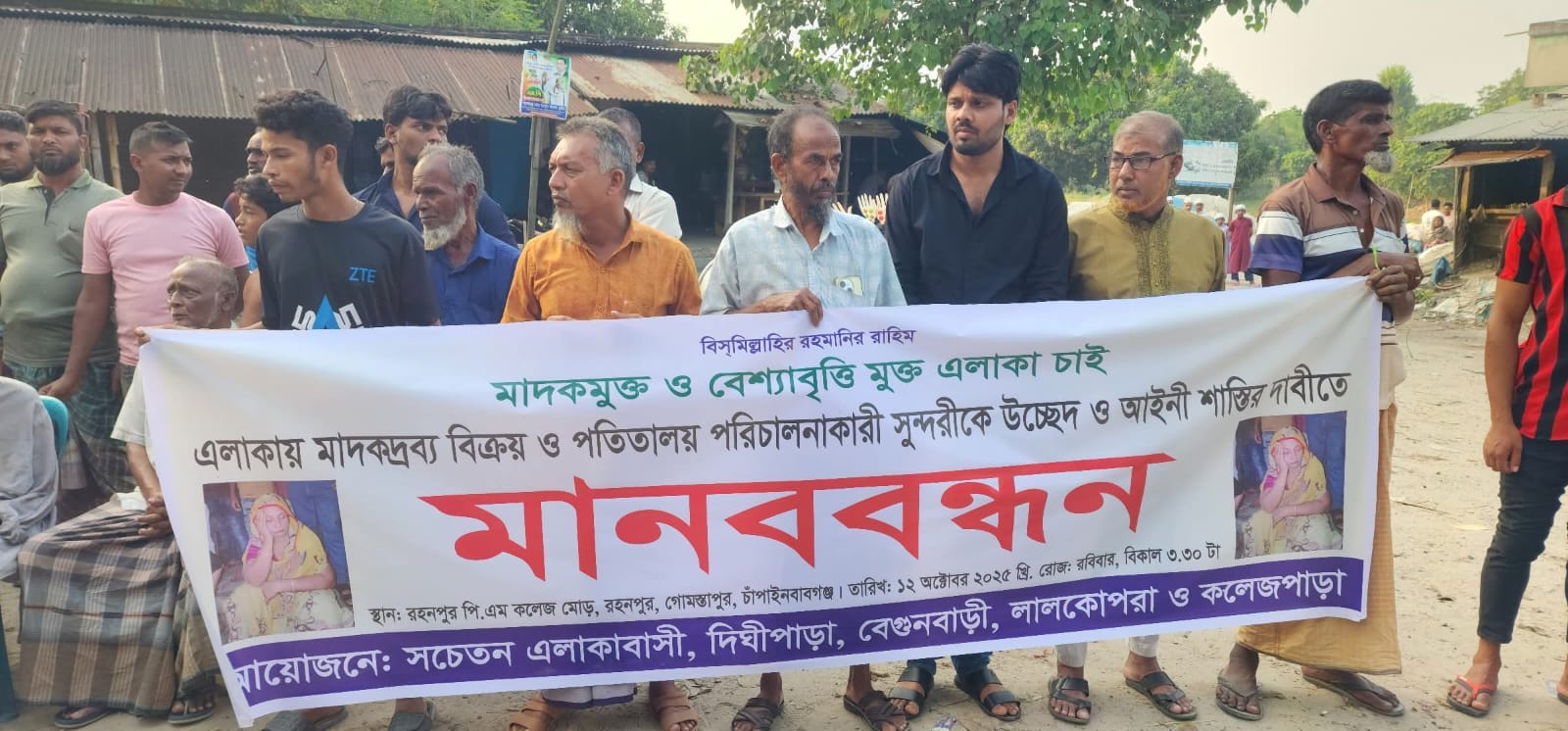 চাঁপাইনবাবগঞ্জের গোমস্তাপুর উপজেলার প্রাণকেন্দ্র রহনপুর পৌরসভার ৬ নং ওয়ার্ড দিঘীপাড়া মহল্লায় পতিতা পরিচালনাকারী সুন্দরীর বাড়িতে দীর্ঘদিন ধরে চলছে মাদক বিক্রয় ও অসামাজিক কাজ চলে আসছে এরই প্রতিবাদে রবিবার বিকেল ৫ টার সময় রহনপুর পিএম কলেজ মোড়স্থ এলাকায় দিঘীপাড়া, বেগুনবাড়ি, লালকোপরা ও কলেজপাড়ার সচেতন এলাকাবাসীর আয়োজনে মানববন্ধনে উপস্থিত ছিলেন বীর মুক্তিযোদ্ধা শহিদুল ইসলাম,প্রফেসর মুকুল ও মোস্তাকিম আহমেদ লালচান। যুবদল নেতা মোস্তাফিজুর রহমান সাগর, নজরুল ইসলাম,সাদিকুল ইসলাম মিরু ,আজাহার মোন্না, পরেস কর্মকার,শাামিমসহ স্বানীয় ব্যক্তিবর্গ।