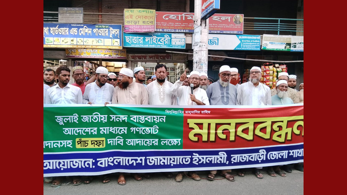 জাতীয় জুলাই সনদ, পিআর পদ্ধতিতে নির্বাচনসহ পাঁচ দফা দাবিতে রাজবাড়ী জেলা জামায়াতের উদ্যোগে মানববন্ধন কর্মসূচি পালন করা হয়েছে।