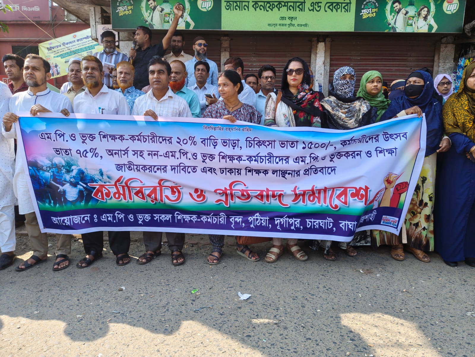 এমপিও ভুক্ত শিক্ষক কর্মচারীদের ২০% বাড়ি ভাড়া চিকিৎসা ভাতা ১৫০০ টাকা কর্মচারীদের উৎসব ভাতা ৭৫% অনার্স সহ নন এমপিও ভুক্ত শিক্ষক কর্মচারীদের এমপিও ভুক্তকরণ ও শিক্ষা জাতীয় করণের দাবিতে এবং ঢাকায় শিক্ষক লাঞ্ছনার প্রতিবাদে কর্ম বিরতি ও প্রতিবাদ সমাবেশ অনুষ্ঠিত হয়।