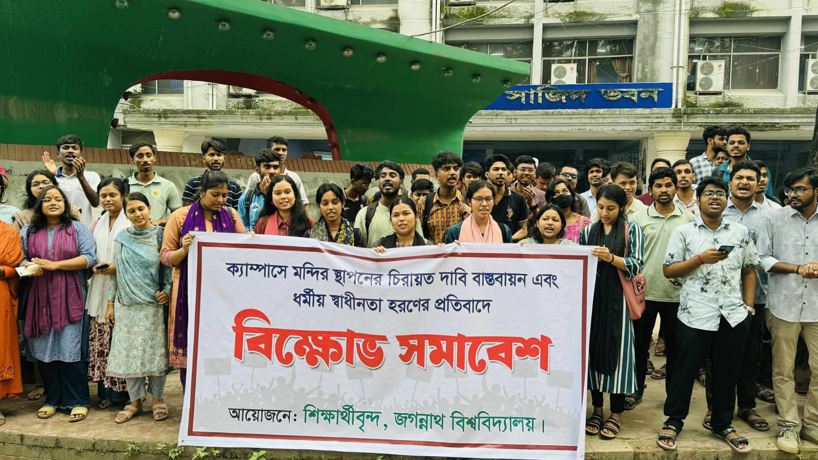 জগন্নাথ বিশ্ববিদ্যালয়ে (জবি) ক্যাম্পাসে মন্দির স্থাপনের দাবি বাস্তবায়ন এবং ধর্মীয় স্বাধীনতা হরণের প্রতিবাদে বিক্ষোভ সমাবেশ করেছে শিক্ষার্থীরা। একই সঙ্গে মন্দির স্থাপনের প্রয়োজনীয় ব্যবস্থা গ্রহণের অনুমতি চেয়ে স্মারকলিপি দিয়েছেন তারা।