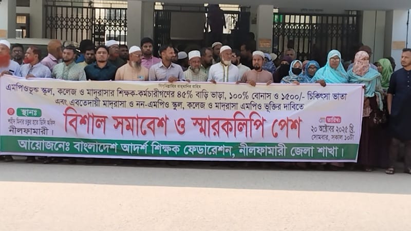 শিক্ষা সংস্কার, এমপিওভুক্তি, বকেয়া ভাতা পরিশোধ ও শিক্ষক-কর্মচারীদের জীবনমান উন্নয়নসহ পাঁচ দফা দাবিতে প্রধান উপদেষ্টার বরাবর স্মারকলিপি প্রদান করেছে বাংলাদেশ আদর্শ শিক্ষক ফেডারেশন নীলফামারী জেলা শাখা।