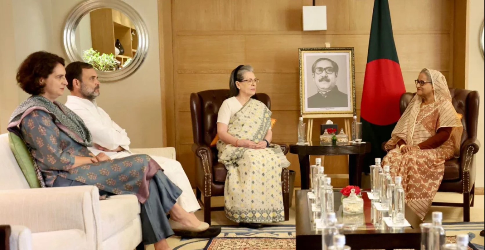 কংগ্রেসের সংসদীয় দলের চেয়ারপারসন সোনিয়া গান্ধী, কংগ্রেসের সাবেক প্রেসিডেন্ট রাহুল গান্ধী এবং দলটির সাধারণ সম্পাদক প্রিয়াঙ্কা গান্ধী ভাদরা – ভারতের নয়াদিল্লিতে আইটিসি মৌর্য হোটেলে আজ সোমবার বিকেলে বাংলাদেশের প্রধানমন্ত্রী শেখ হাসিনার সঙ্গে সাক্ষাৎ করেছেন । ভারতীয় সংবাদমাধ্যম হিন্দুস্তান টাইমসের এক প্রতিবেদনে এ তথ্য জানানো হয়েছে।