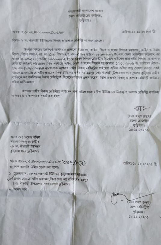কিন্তু পরবর্তীতে আইন, বিচার ও সংসদ বিষয়ক মন্ত্রণালয়ের ১২-১০-২০০৬ ইং তারিখের বিচার-৭/২ এন-৫৮/২০০৩/৭৬৪ নং-স্মারকে আপনার নামীয় নিকাহ রেজিস্ট্রার লাইসেন্স বাতিল করিয়া শুণ্য ঘোষণা করতঃ একই স্মরকে জনাব মোঃ হোসাইন আহমেদ, পিতা মোঃ আঃ ও সাং-ছত্রপুর, পোঃ পাঁচগাছী, উপজেলাঃ সদর, জেলাঃ কুড়িগ্রাম নামীয় ব্যাক্তিকে অত্র ইউনিয়নের নিকাহ রেজিস্ট্রার হিসেবে লাইসেন্স প্রদান করেন।