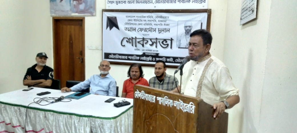 মৌলভীবাজার পাবলিক লাইব্রেরির আজীবন সদস্য, বাংলাদেশ সাংবাদিক সমিতি জেলা ইউনিটের সহ-সভাপতি ও মাছরাঙা টেলিভিশনের জেলা প্রতিনিধি মরহুম তমাল ফেরদৌস দুলালের স্মরণে এক শোকসভা অনুষ্ঠিত হয়েছে। শুক্রবার (১৪ নভেম্বর) সন্ধ্যায় শহরের সৈয়দ মুজতবা আলী মিলনায়তনে মৌলভীবাজার পাবলিক লাইব্রেরি ও জেলার সংস্কৃতিকর্মীদের উদ্যোগে আয়োজিত এ অনুষ্ঠানে সভাপতিত্ব করেন পাবলিক লাইব্রেরির সম্পাদক শাহ আঃ ওদুদ।