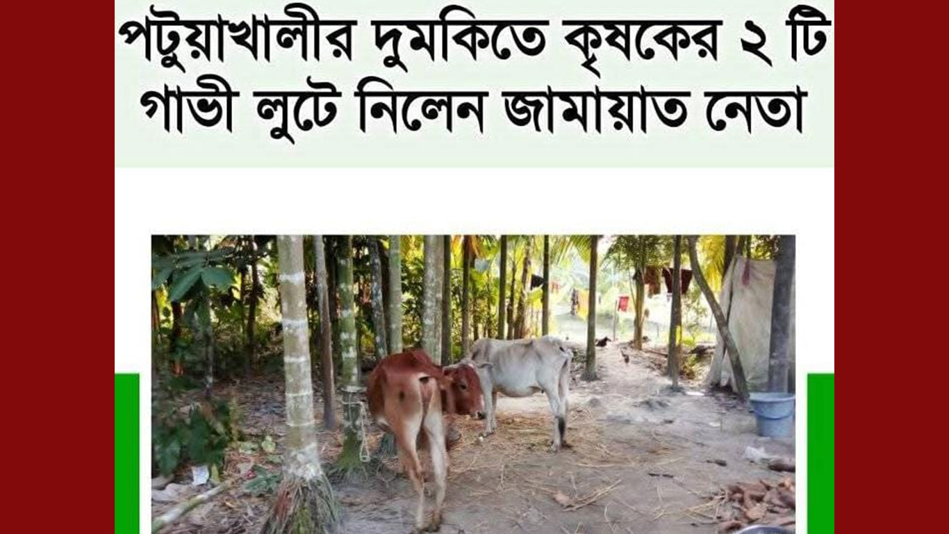 পটুয়াখালী জেলার দুমকি উপজেলার দক্ষিণ মুরাদিয়া গ্রামের কৃষক আব্দুল বারেক মজুমদারের গোয়ালঘর থেকে দুইটি গাভী জোরপূর্বক লুটে নিয়ে যাওয়ার অভিযোগ উঠেছে মুরাদিয়া ইউনিয়ন জামায়াতে ইসলামের সাধারণ সম্পাদক জলিল প্যাদার বিরুদ্ধে। ঘটনাটি ঘটে শুক্রবার দুপুর ১২টার দিকে।অসহায় বারেক মজুমদার এ বিষয়ে নিরুপায় হয়ে ইউনিয়ন পরিষদ চেয়ারম্যান হাফিজুর রহমান ফোরকানকে অভিযোগ জানান।