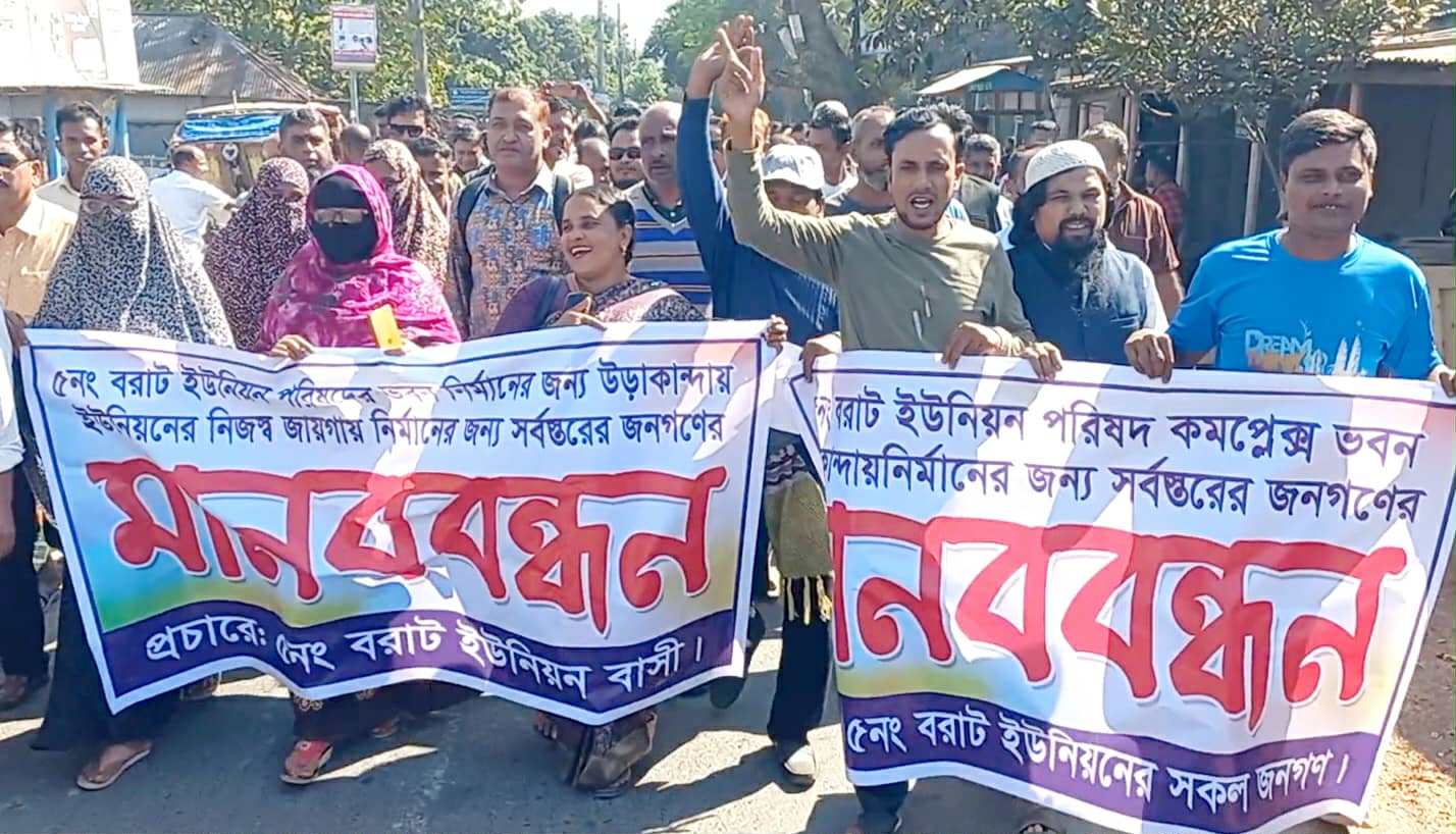 মানববন্ধন-বিক্ষোভ ও স্মারকলিপি প্রদান রাজবাড়ীর “বরাট” ইউনিয়ন পরিষদ কমপ্লেক্স উড়াকান্দায় নির্মাণের দাবি