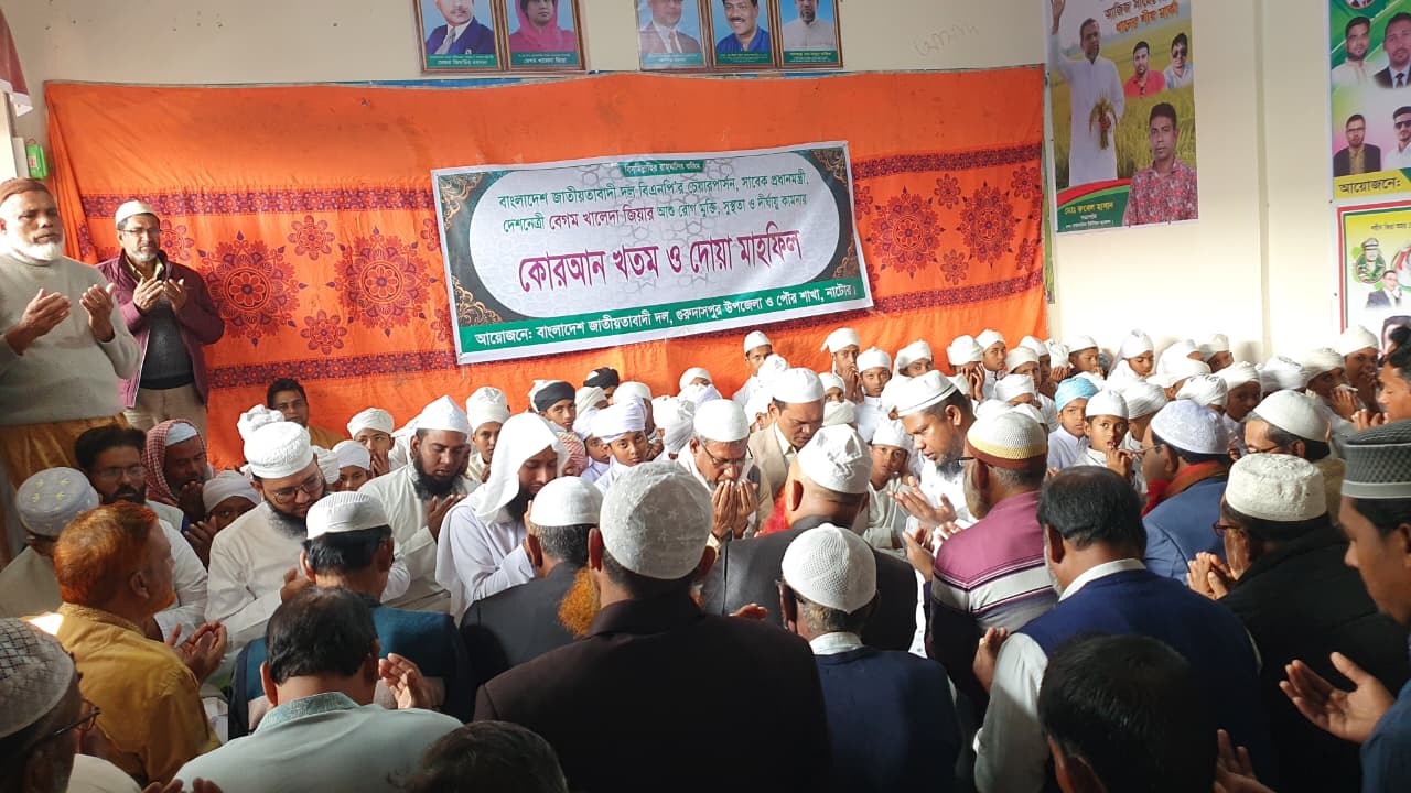 সাবেক প্রধানমন্ত্রী বেগম খালেদা জিয়ার আশু রোগমুক্তি, সুস্থতা ও দীর্ঘায়ু কামনায় নাটোরের গুরুদাসপুরে বিএনপির আয়োজনে কুরআন খতম ও দোয়া মাহফিল অনুষ্ঠিত হয়েছে। আজ (৩০ নভেম্বর) রবিবার সকালে উপজেলার নয়াবাজার এলাকায় নাটোর -৪ আসনে বিএনপির মনোনিত এমপি প্রার্থীর নির্বাচনী প্রধান কার্যালয়ে ওই দোয়া মাহফিল অনুষ্ঠিত হয়।