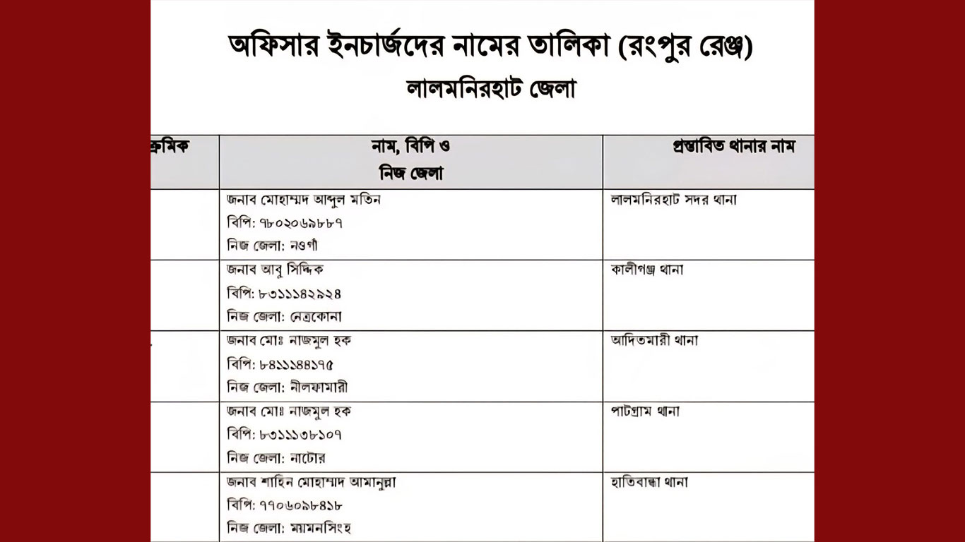 ৫. হাতীবান্ধা থানাহাতীবান্ধায় ওসি হিসেবে দায়িত্ব পাচ্ছেন মাহির মোহাম্মদ আসাদুল্লা, বিপি নম্বর ৭১০৪০৮৮১৮। তার নিজ জেলা মানিকগঞ্জ।