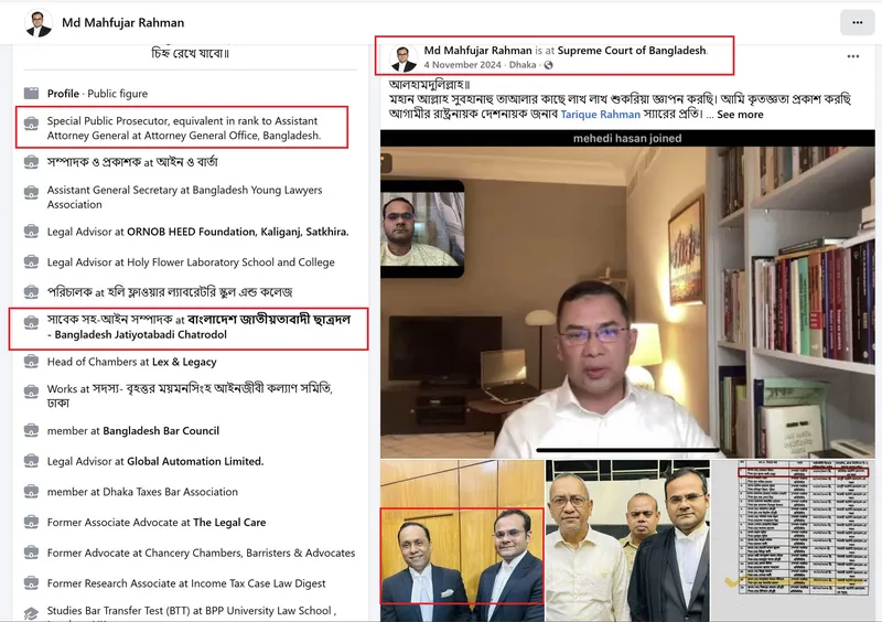 তবে রোববার আদালত খোলার পর জামিন পিটিশন ও এফিডেভিট সংগ্রহ করে দ্য ডিসেন্ট জানায়, মাহফুজার রহমান তাদের আগের বক্তব্যে অসত্য তথ্য দিয়েছেন। কারণ পিটিশন ও এফিডেভিটে থাকা আইনজীবী মো. মাহফুজার রহমানের নাম, মোবাইল নম্বর, মেম্বারশিপ আইডি এবং ছবি সুপ্রিম কোর্ট বার অ্যাসোসিয়েশনের ডাটাবেজে থাকা তার তথ্যের সঙ্গে সম্পূর্ণ মিল রয়েছে। এফিডেভিটে যুক্ত ছবিটি ‘Md Mahfujar Rahman (Eliyash)’ নামের একটি ফেসবুক আইডির প্রোফাইল ছবির সঙ্গেও একেবারে মিলেছে।