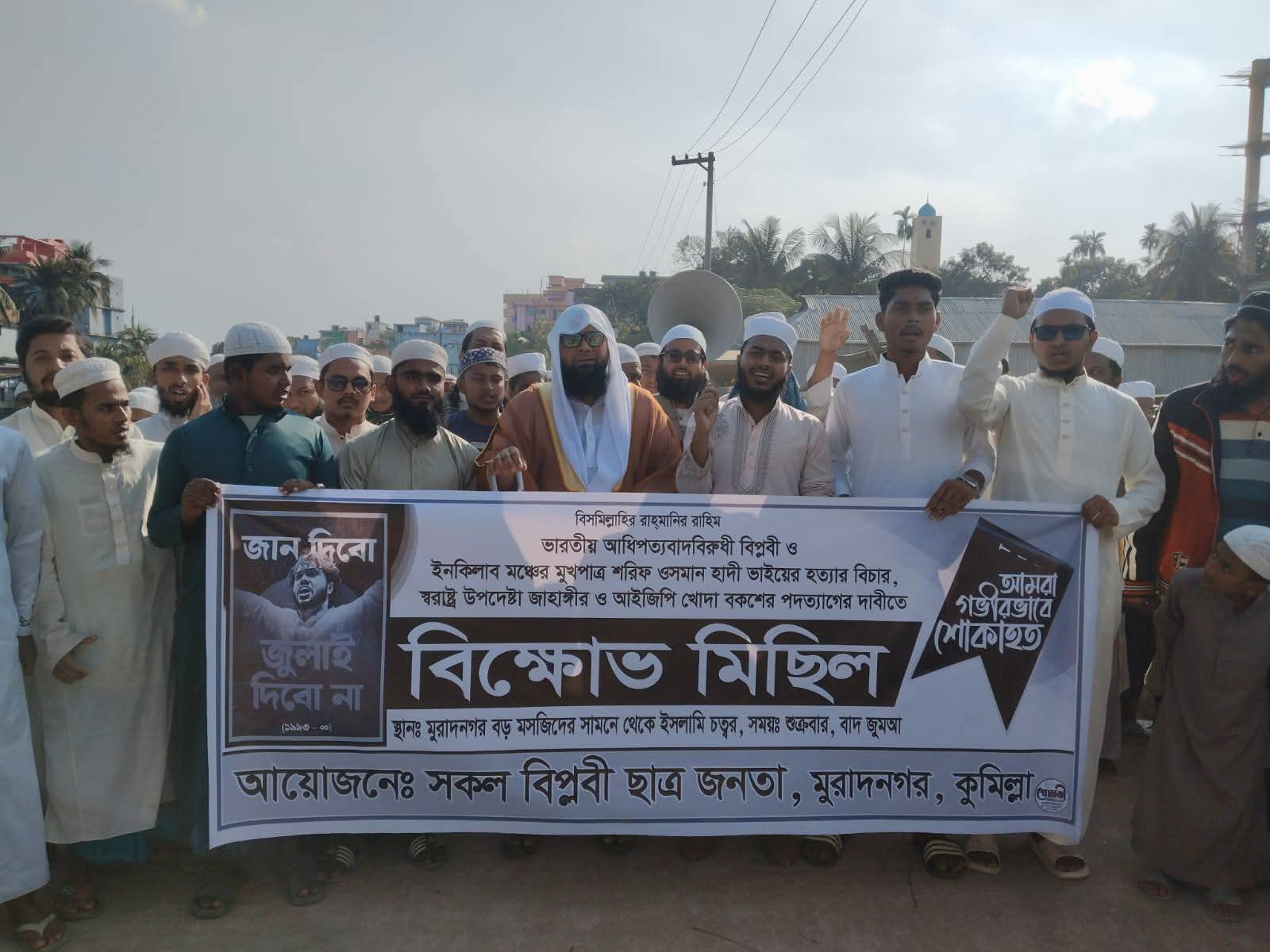 শুক্রবার (১৯ ডিসেম্বর) বাদ জুম’আ মুরাদনগর বড় মাদরাসার সামনে থেকে বিক্ষোভ মিছিলটি শুরু হয়। মিছিলটি শহরের প্রধান প্রধান সড়ক প্রদক্ষিণ করে থানার সামনে এসে সংক্ষিপ্ত সমাবেশের মাধ্যমে কর্মসূচি সমাপ্ত হয়।