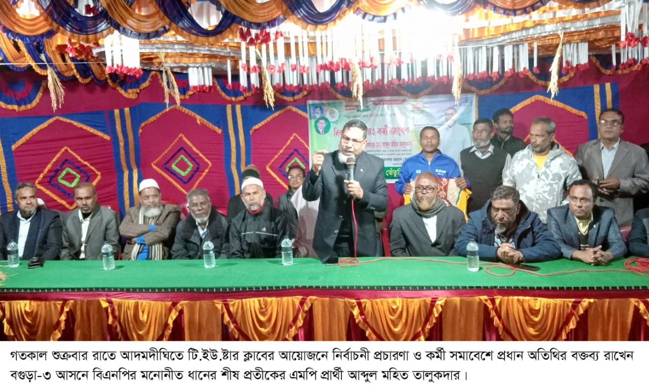 গত শুক্রবার (১৯ ডিসেম্বর) রাতে আদমদীঘি উপজেলার তেঁতুলিয়া গ্রামে টি.ইউ.ষ্টার ক্লাব আয়োজিত নির্বাচনী প্রচারণা ও কর্মী সমাবেশে প্রধান অতিথির বক্তব্যে এ কথা গুলো বলেন।