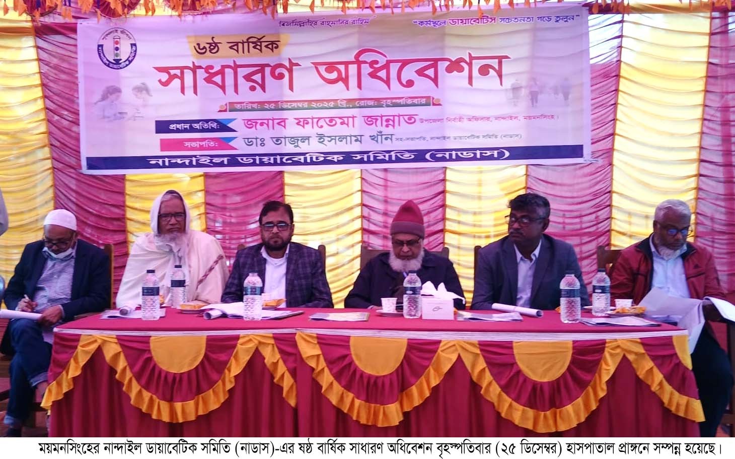 ময়মনসিংহের নান্দাইল ডায়াবেটিক সমিতি (নাডাস)-এর ষষ্ঠ বার্ষিক সাধারণ অধিবেশন সম্পন্ন হয়েছে। বৃহস্পতিবার (২৫ ডিসেম্বর) দুপুরে উপজেলা ডায়াবেটিক হাসপাতাল প্রাঙ্গণে সমিতির নিজস্ব আয়োজনে এই অধিবেশন অনুষ্ঠিত হয়। সমিতির সহ-সভাপতি ডা. তাজুল ইসলাম খানের সভাপতিত্বে এবং সাধারণ সম্পাদক অ্যাডভোকেট হাবিবুর রহমান ফকিরের সঞ্চালনায় অনুষ্ঠানে বক্তারা সমিতির বর্তমান কার্যক্রম ও ভবিষ্যৎ কর্মপরিকল্পনা নিয়ে বিস্তারিত আলোচনা করেন।